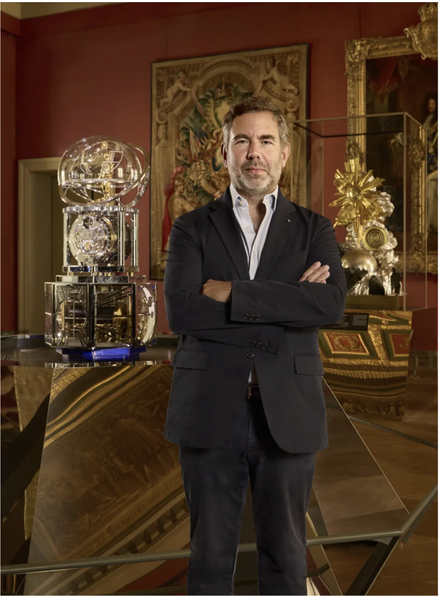 Kustos Luvra Olivier Gabet stoji ispred La Quête du Temps (levo) i La Création du Monde (desno), sata od srebra i bronze poklonjenog Louis XV 1754. godine. To složeno horološko delo restaurirao je Vacheron Constantin za Luvr 2016. godine, čime je započeto partnerstvo između dve institucije | Vacheron Constantin
