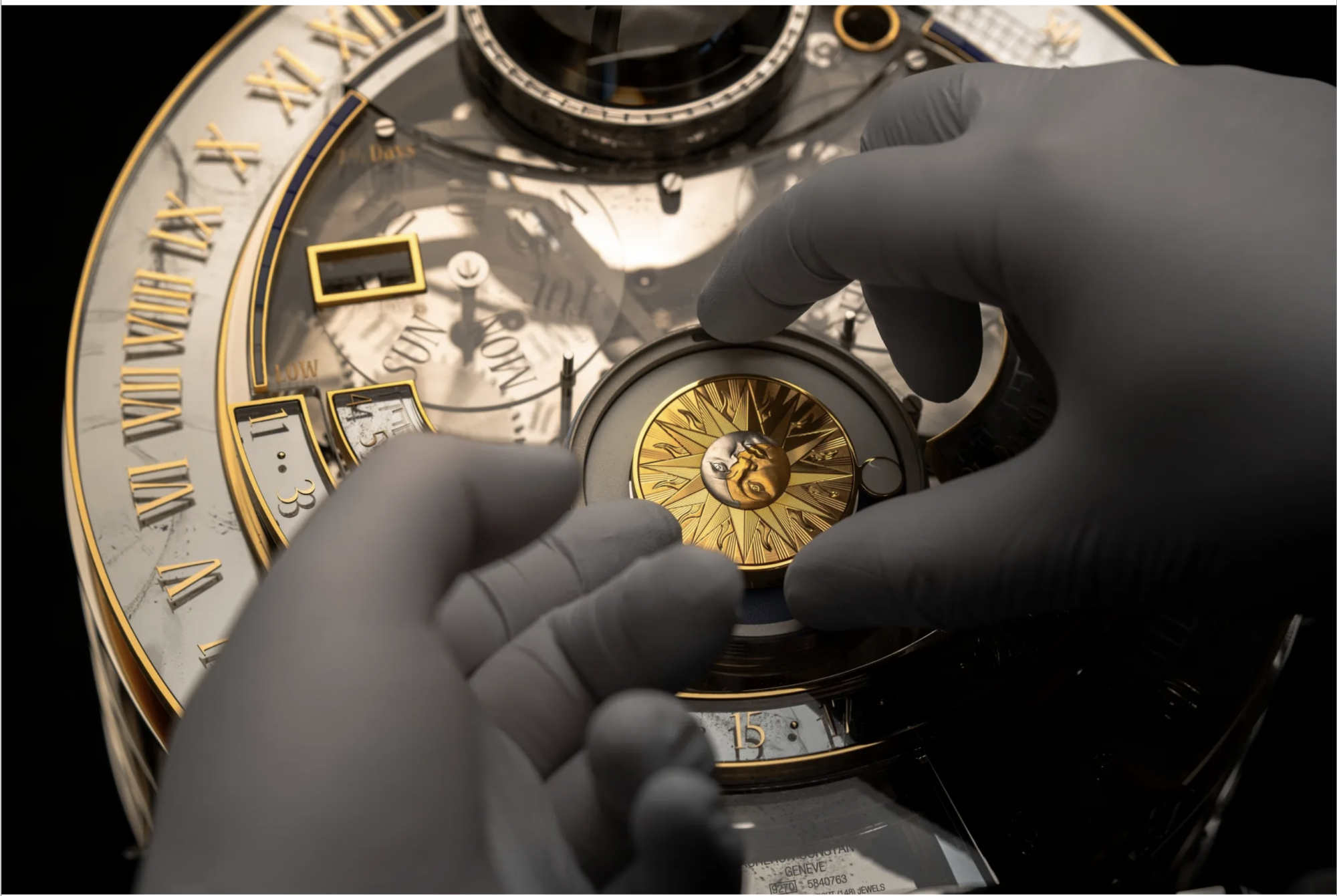 Majstor sastavlja prednju tablu La Quête du Temps, gde se vide prikazi večnog kalendara. Sunce i mesec na medaljonu označavaju dan i noć | Vacheron Constantin
