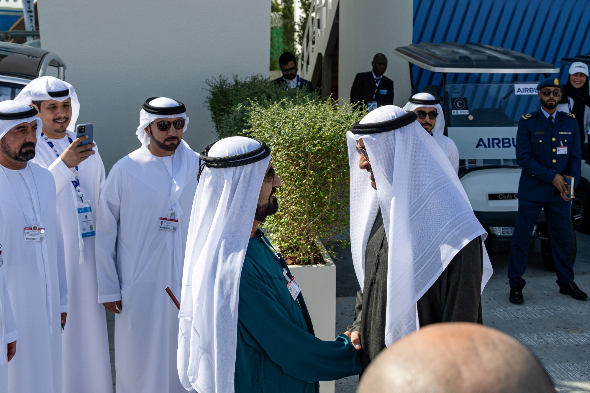 Šeik Mohammed bin Zayed Al Nahyan, predsednik Ujedinjenih Arapskih Emirata, desno, rukuje se sa šeikom Mohammedom bin Rashidom Al Maktoumom, vladarom Dubaija, na Sajmu vazduhoplovstva u Dubaiju, održanom u novembru|Christopher Pike/Bloomberg
