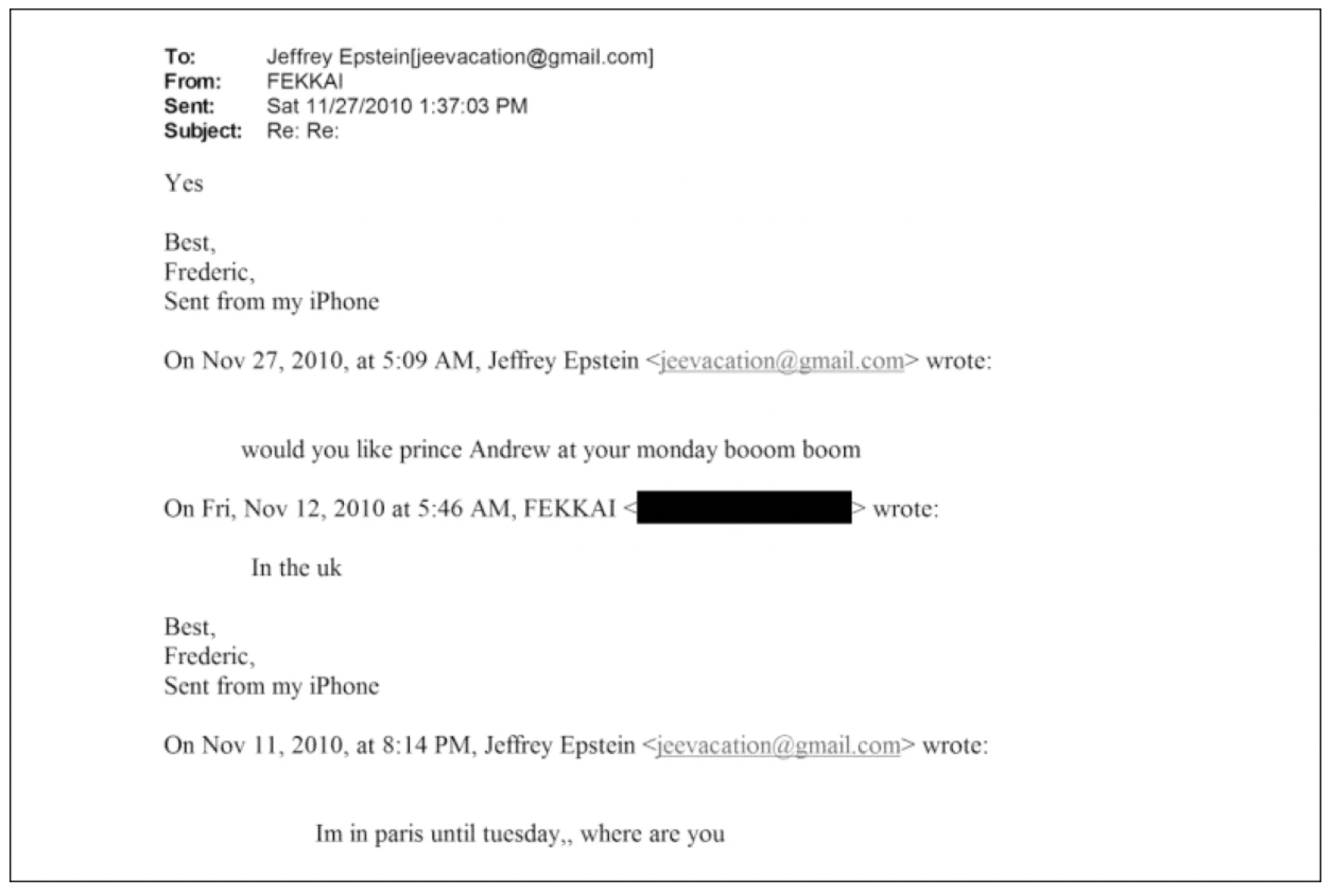 Fekkaijeva supruga, Shirin von Wulffen, pozvala je 2010. godine Epsteina na "veče pića i plesa" u Top of the Standard – tada jedan od najekskluzivnijih klubova u Njujorku, poznat i kao Boom Boom Room – da proslavi Fekkaijevo odlikovanje u Francuskoj. "Da li biste želeli da se princ Andrew pridruži vašoj zabavi u ponedeljak u Boom Boom?", napisao je Epstein. "Da", odgovorio je Fekkai.