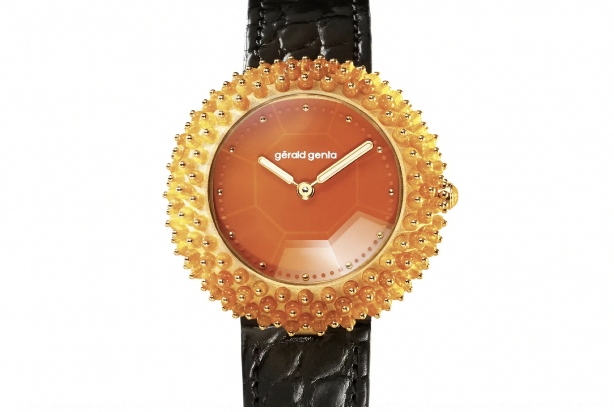 Brend Gérald Genta, u vlasništvu LVMH, osvojio je Ladies’ Watch Prize na 2025 Grand Prix d’Horlogerie de Genève, za ovaj vatreni, "morski jež" model sa 137 komada vatrenog opala i narandžastim karneol brojčanikom. Autor posebno voli osmougaoni kristal, a njegova petogodišnja ćerka je, gledajući ga na ekranu, rekla: "To želim." Cena: na zahtev