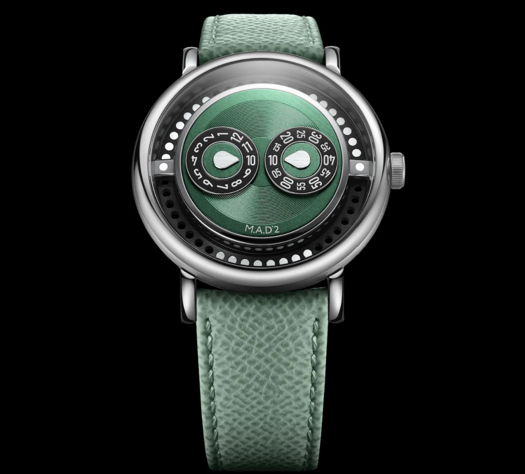 Ovaj model više nije dostupan jer je distribuiran putem lutrije, ali ga obožavam. Radi se o saradnji MB&F tima sa dizajnerom Eric Giroudom. Ima dvosmerni jumping-hour modul, a pokreće ga švajcarski La Joux-Perret mehanizam sa 64 sata rezerve snage. Rotor se okreće iza brojčanika, stvarajući vizuelni efekat kroz tačkice oko ivice. Možete ga pronaći na sekundarnom tržištu (cena oko 6,000 dolara) ili čekati sledeće M.A.D. Editions lutrije.