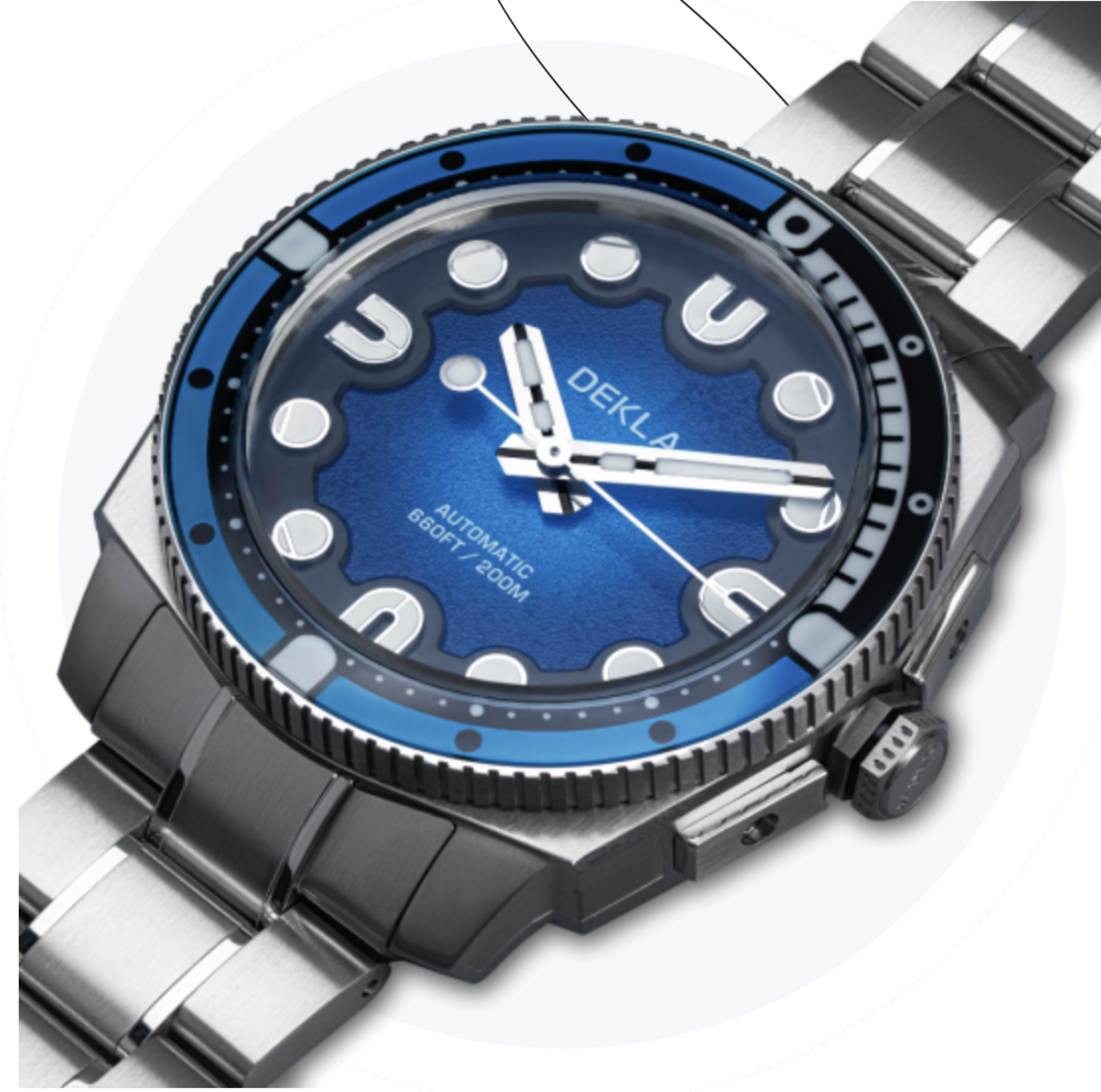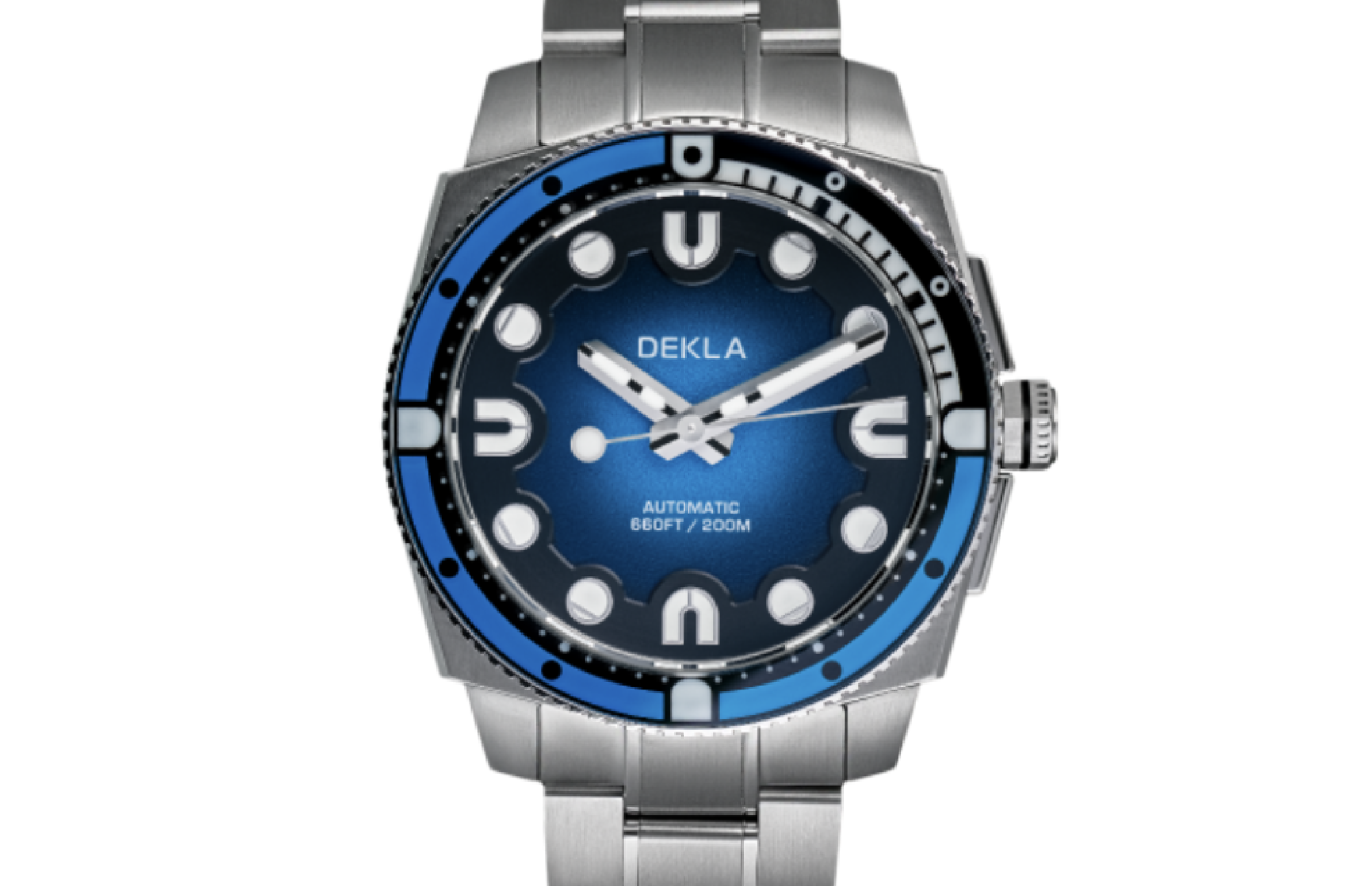 Рамката на моделот „сиборн“ изработена од не'рѓосувачки челик и сафир. Обликот „U“ на позициите 3, 6, 9 и 12 часот се издвојува, инспириран од првата буква од зборот Украина, како знак на почит кон потеклото на сопствениците на компанијата. | Dekla Watches