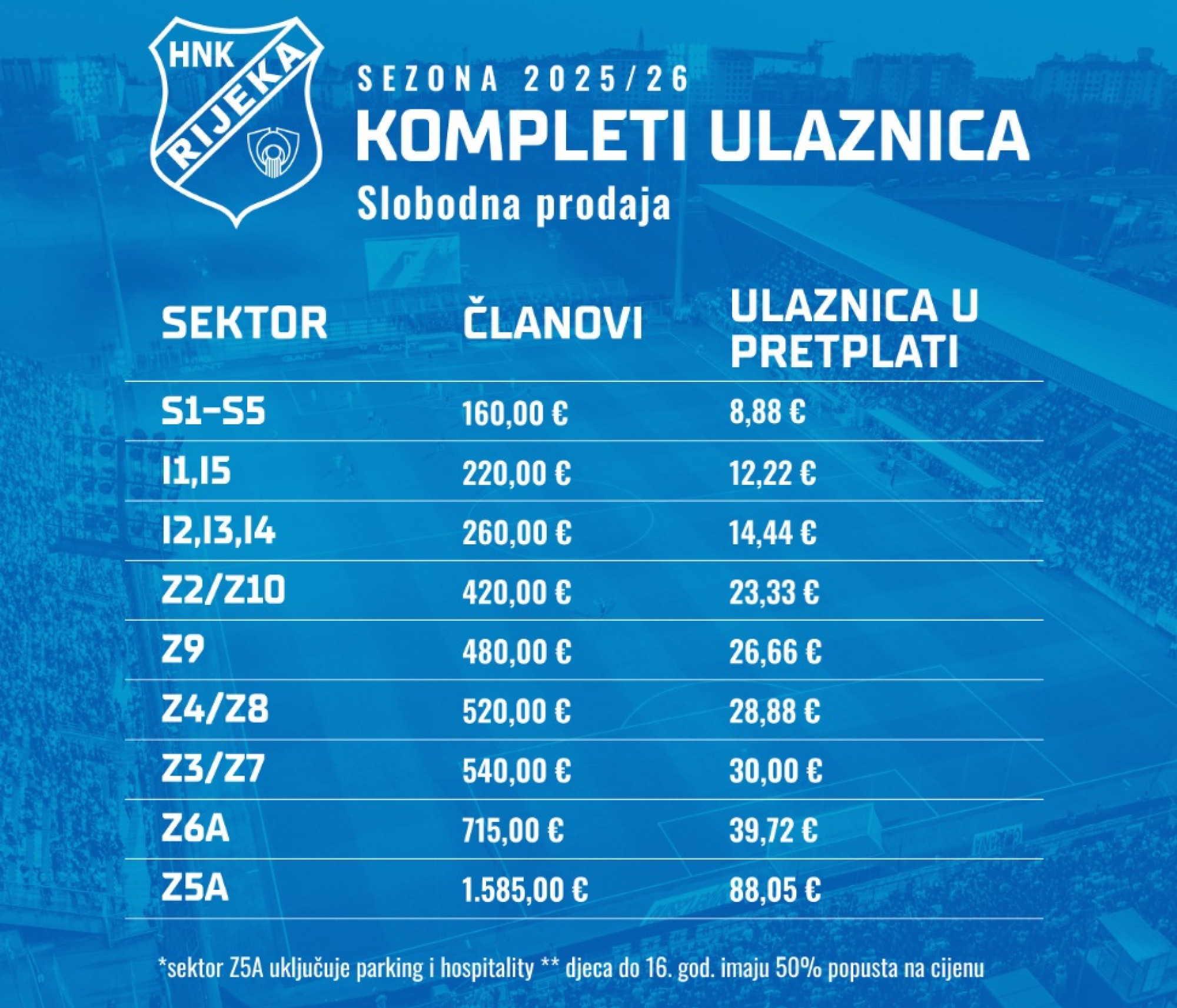 Deca članovi do 16 godina dobijaju popust od 50 odsto, kao i penzioneri sa penzionerskim sertifikatom i članskom kartom HNK Rijeka, i to na porodičnim tribinama.