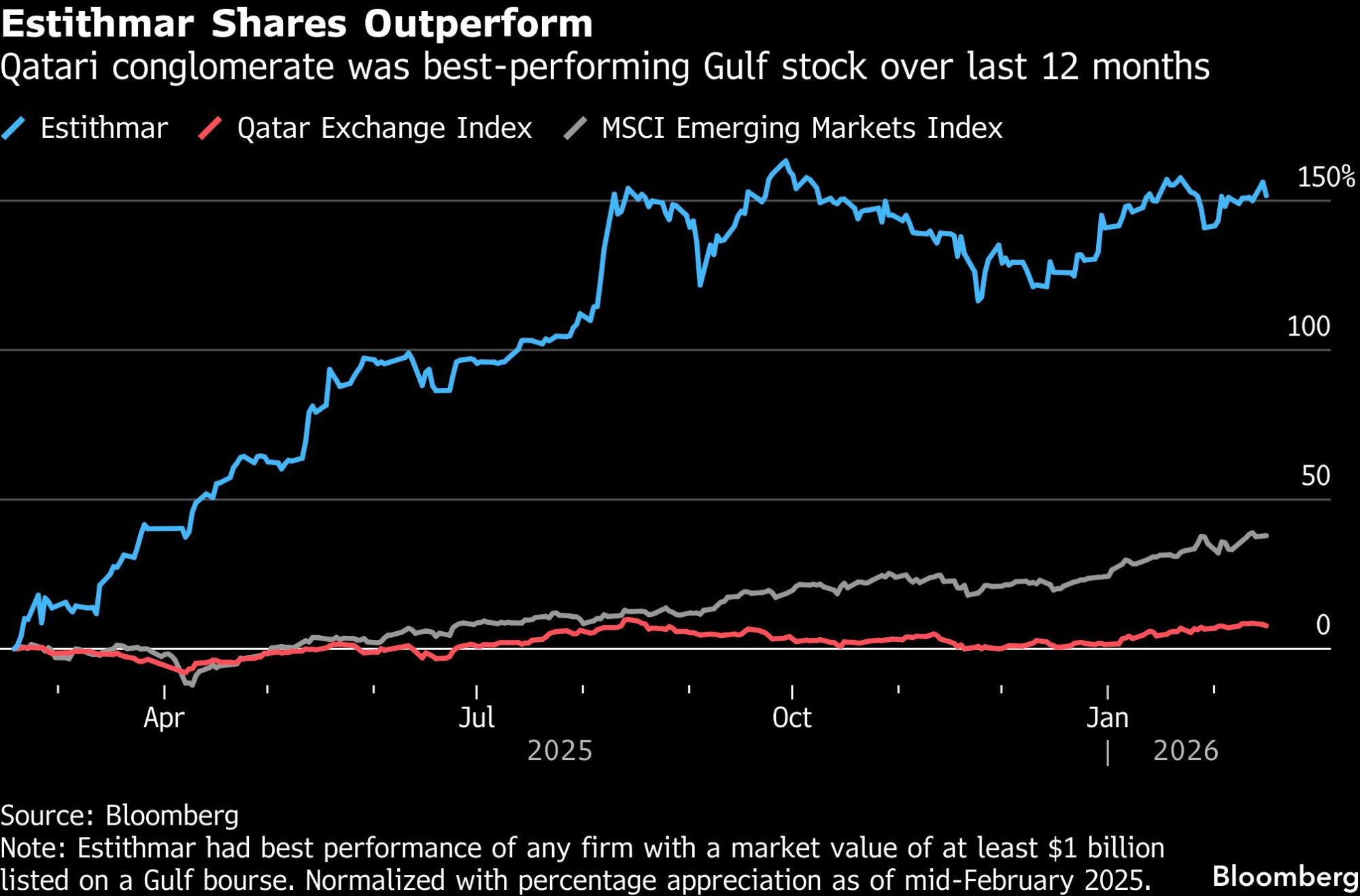 Akcija je u trgovanju u Dohi u poslednjih 12 meseci skočila za 152 odsto, čime je tržišna vrednost Estithmara dostigla 4,3 milijarde dolara. To je znatno nadmašilo osam odsto rasta referentnog indeksa Qatar Exchange i 38 odsto rasta indeksa MSCI Emerging Markets u istom periodu.