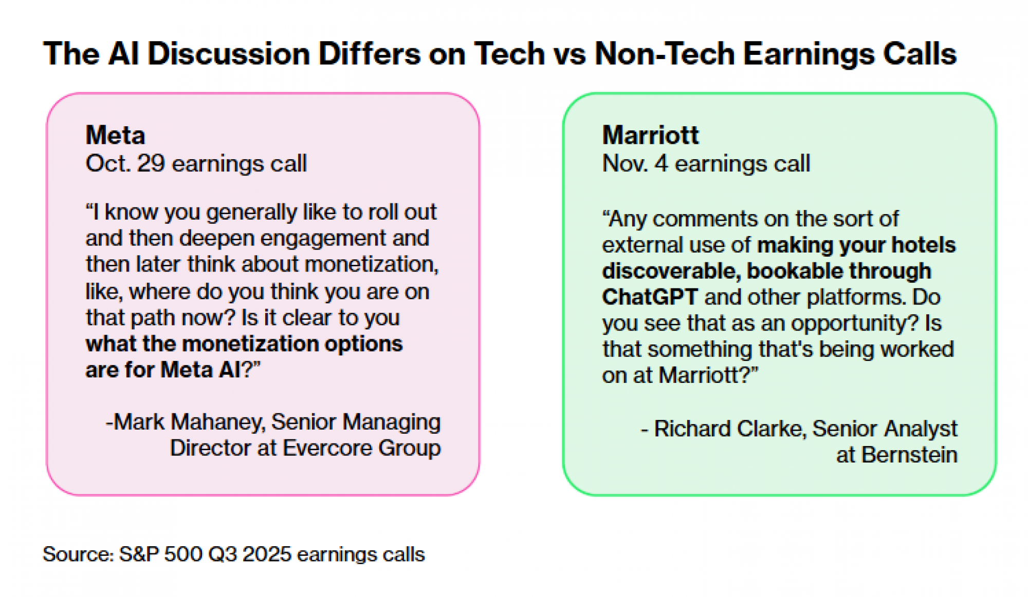Menadžmentski timovi u sektorima kao što su finansije i nekretnine počinju da dobijaju više pitanja o svojim AI strategijama. Ali ta linija ispitivanja i dalje je retka. Tokom poziva povodom zarada, analitičari obično daju prioritet onome što smatraju najvećim ili najhitnijim pitanjima za kompanije koje prate.