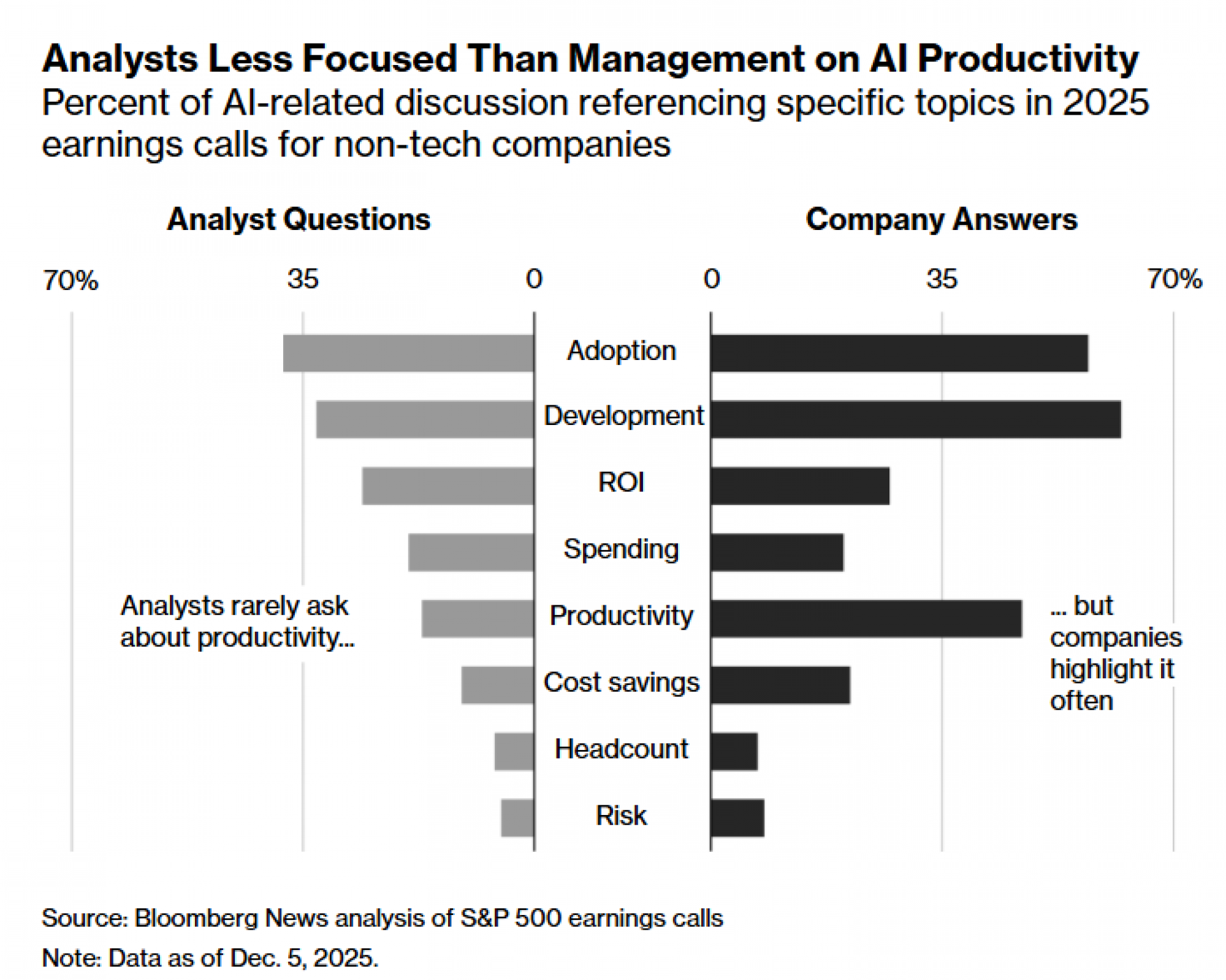 Većina diskusije o AI, kada se pojavi tokom dela pitanja i odgovora na pozivima netehnoloških kompanija, odnosi se na usvajanje i razvoj. Neki analitičari pitaju o očekivanim povraćajima i planovima potrošnje vezanim za AI. Menadžment, s druge strane, češće ističe dobitke u produktivnosti povezane s tom tehnologijom.
