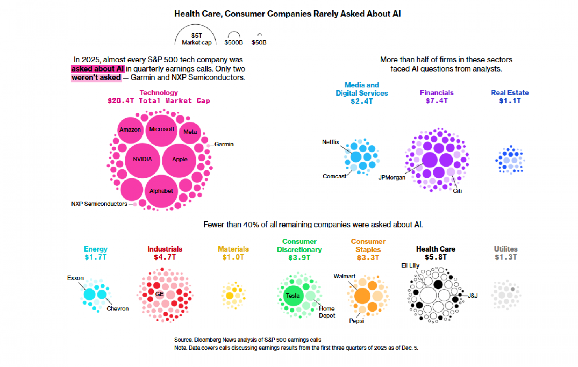 Bloombergov pregled više od 7.000 transkripata poziva povodom zarada, sproveden uz pomoć velikog jezičkog modela, obuhvatio je pitanja o AI namenjenoj da imitira ili unapredi ljudske sposobnosti razmišljanja, zaključivanja, rešavanja problema, donošenja odluka ili obavljanja složenih zadataka. Analiza je isključila pitanja o automatizaciji fabrika, samovozećim vozilima i zakupu ili finansiranju data-centara.
