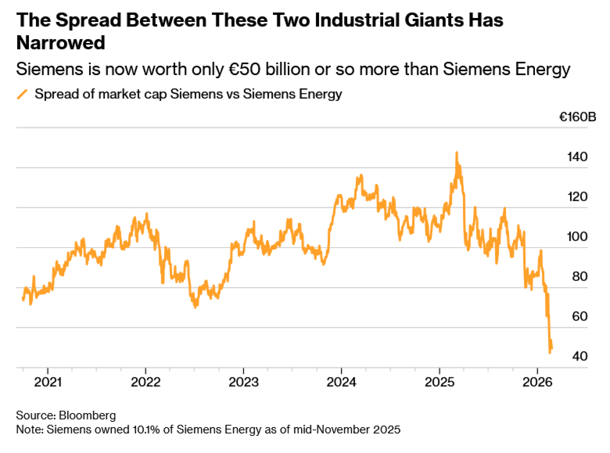 Razlika u tržišnoj vrednosti između dva Siemensova poslovanja smanjila se sa gotovo 150 milijardi evra prošlog proleća na oko 50 milijardi evra, iako su prihodi i dobit kompanije Siemens AG znatno veći.