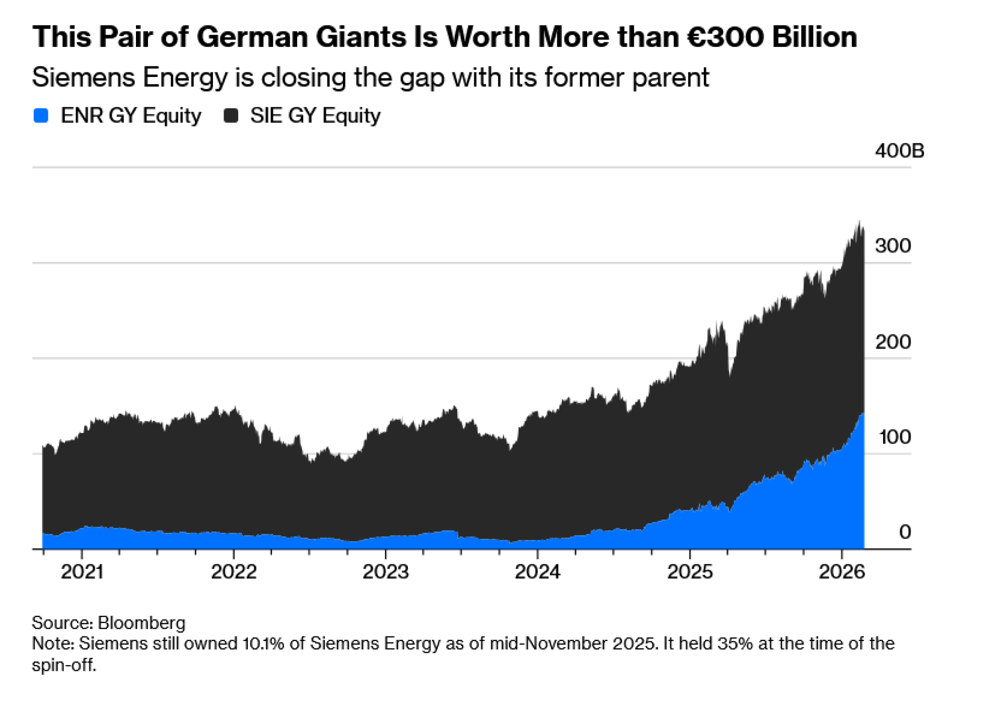 Zamislite da su Siemens AG i Siemens Energy AG još uvek jedna kompanija. Na papiru bi to bila treća najvrednija evropska kompanija s ukupnom tržišnom vrednošću od oko 320 milijardi evra. Samo holandski proizvođač opreme za proizvodnju poluprovodnika ASML Holding NV i farmaceutski div Roche Holding AG vrede više.