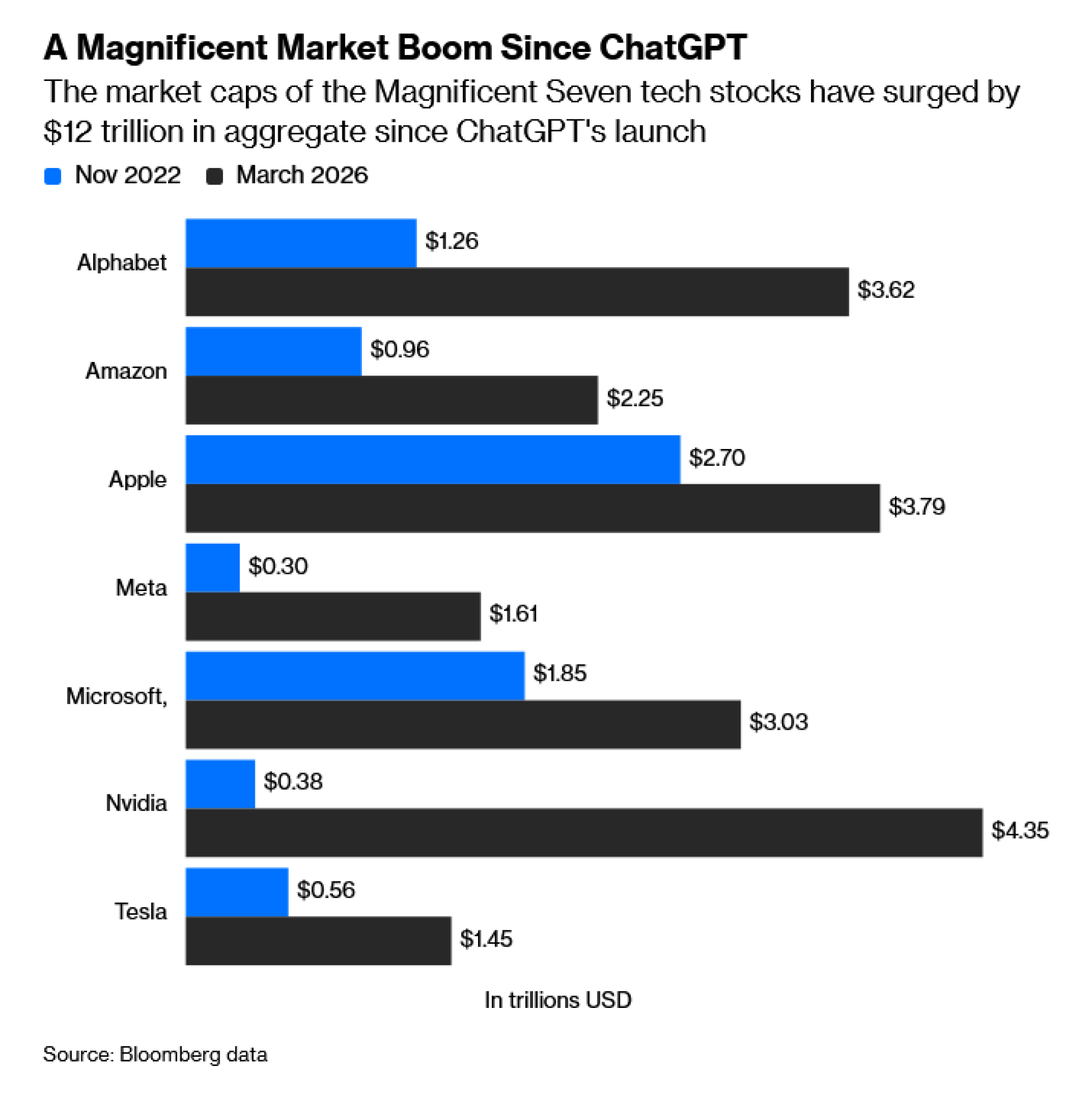 U tri godine otkako je ChatGPT pokrenuo procvat generativne veštačke inteligencije, tržišne kapitalizacije tehnoloških akcija grupe Magnificent Seven porasle su za 12 biliona dolara, a njihova ukupna vrednost (oko 20 biliona dolara) sada je jednaka bruto domaćem proizvodu Kine. Neki od tih divova poput Microsofta i Alphabeta stoje iza danas najpopularnijih chatbotova. I dok se grupa obećavajućih startupova nekada možda mogla suprotstaviti njihovoj prevlasti, te su pridošlice veliki starosedeoci uglavnom usisali putem prikrivenih akvizicija.