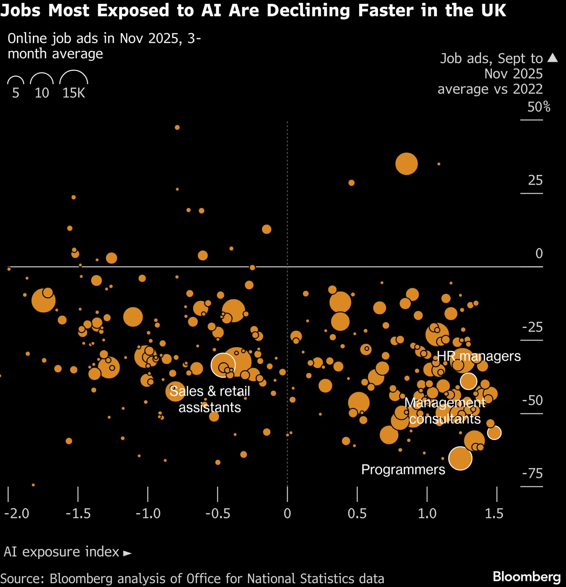 Iako se u celini smanjuje broj oglasa za posao, britanske firme manje zapošljavanju ljude za poslove koje može da radi AI, poput softverskih programera ili konsultanata, pokazuje analiza Bloomberga zasnovana na podacima o onlajn oglasima britanskog Zavoda za statistiku (Office for National Statistics).