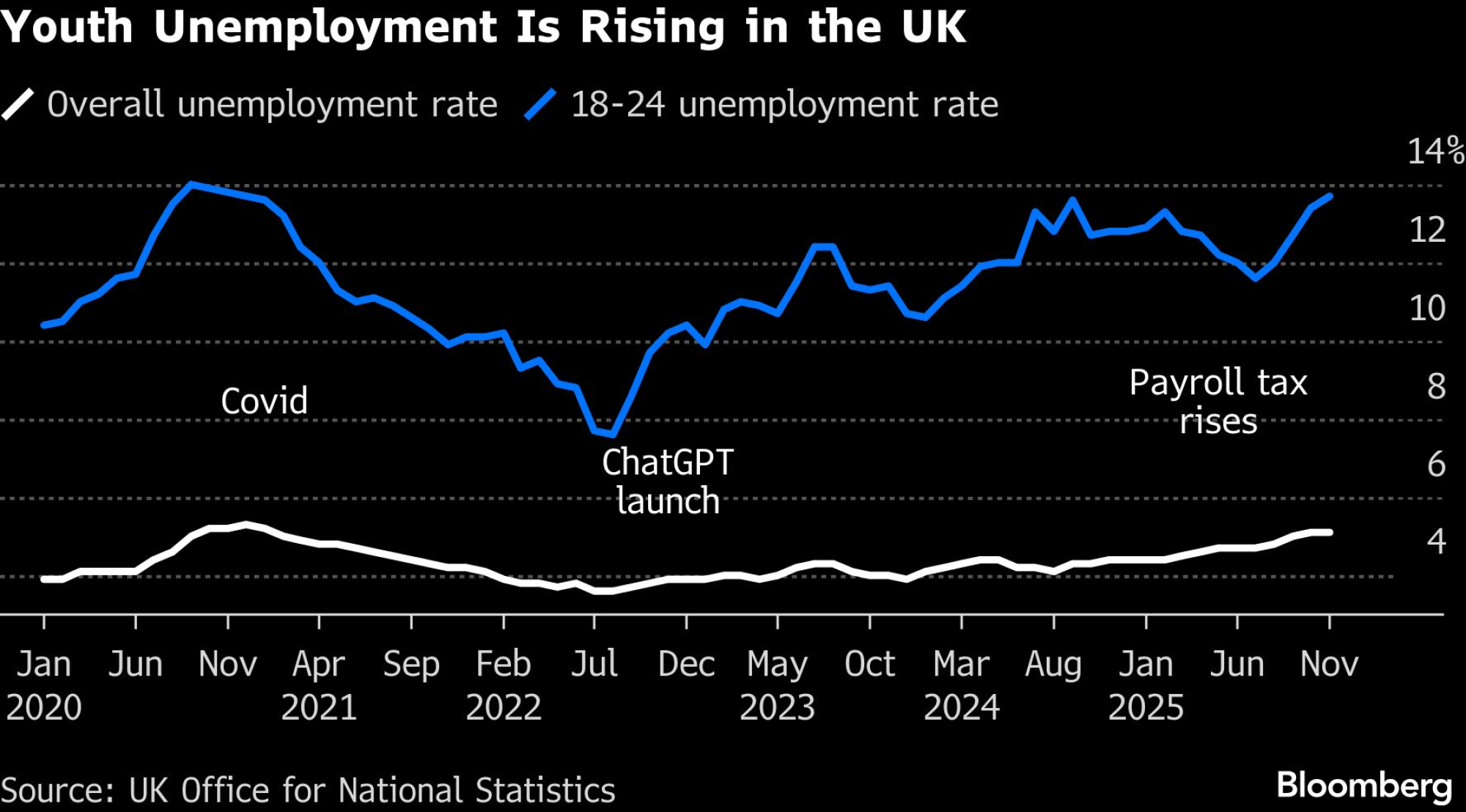 Najmlađi radnici u Britaniji se suočavaju sa pritiskom sa dve strane: AI menja prilike kada je reč o poslovima početnog nivoa u kancelarijama, dok porezi i politike vlade otežavaju zapošljavanje u maloprodaji i ugostiteljstvu. Nezaposlenost mladih raste brže od ukupne stope, dostigavši 13,7 odsto u periodu od tri meseca zaključno sa novembrom, što je najviša stopa od 2020.
