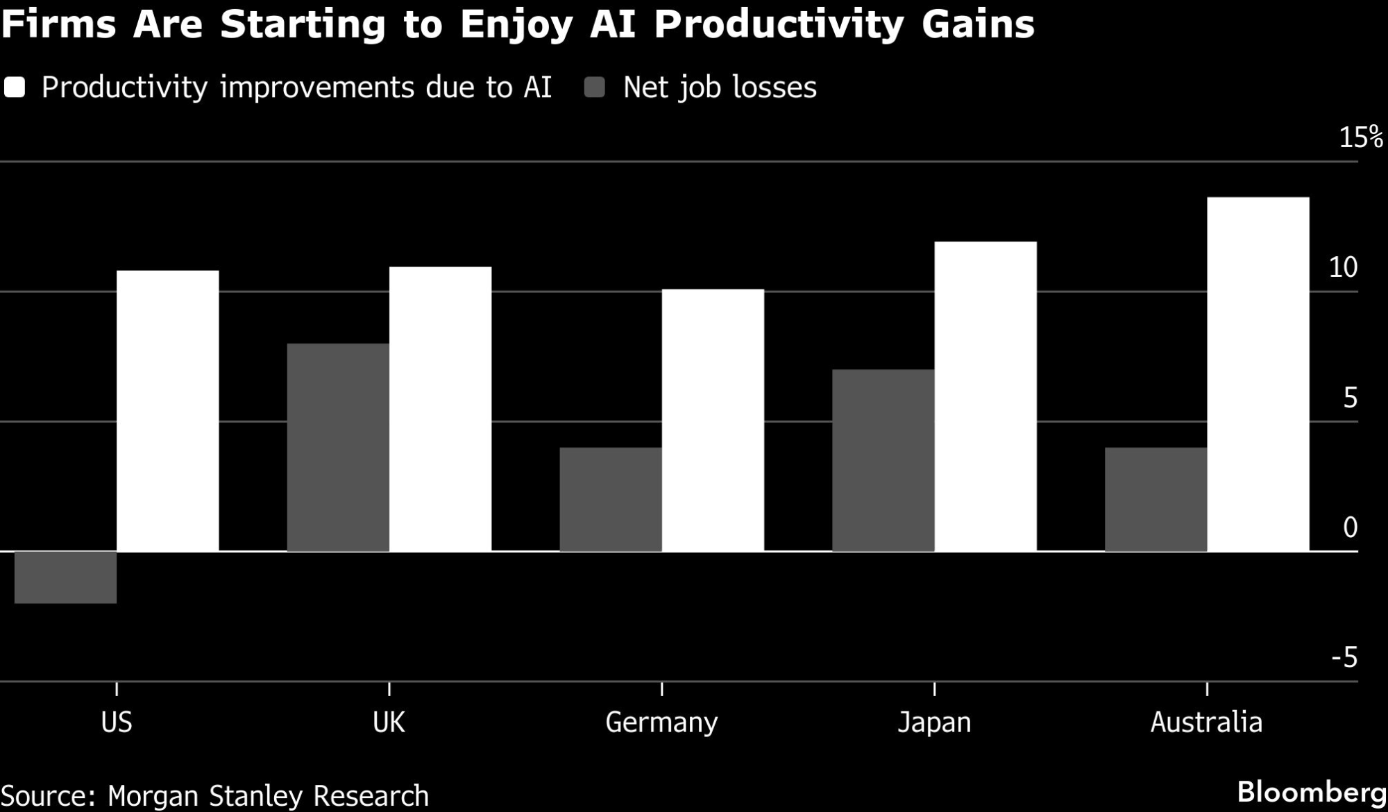 Izveštaj Morgan Stanleya je pokazao da je primena AI dovela do toga da poslodavci u Velikoj Britaniji ukinu ili ne popunje oko četvrtine radnih mesta, slično kao i u drugim zemljama. Međutim, britanske firme su znatno ređe zapošljavale nove radnike zbog uvođenja tehnologije.