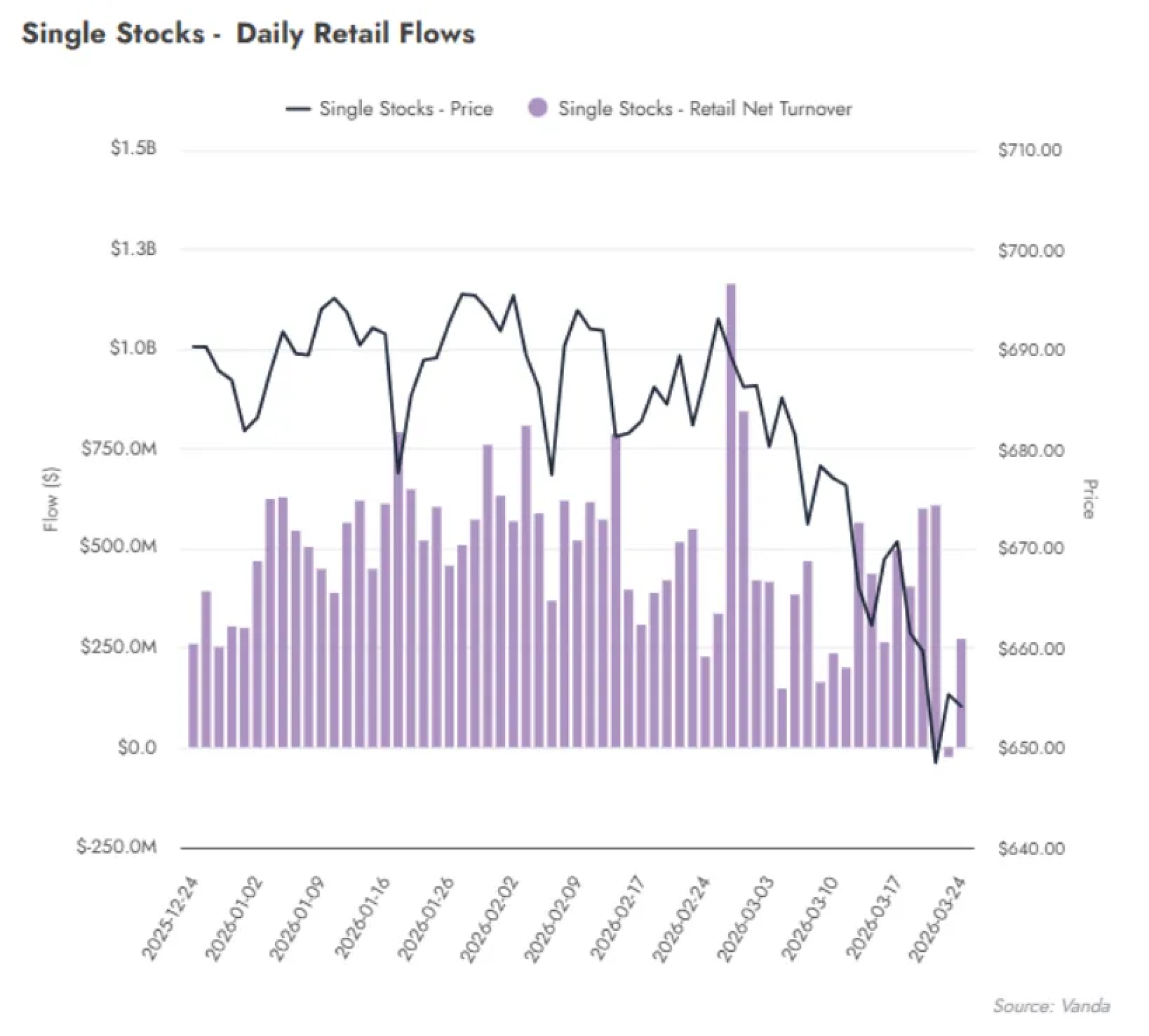 Ta grupa je u ponedjeljak zabeležila prvi dan neto prodaje pojedinačnih akcija od novembra 2023. godine, rasprodavši akcije u vrednosti od 20,6 miliona dolara, pokazuju podaci firme Vanda Research. Do toga je došlo usled oporavka indeksa S&P 500 nakon što je predsednik Donald Trump povukao prethodne pretnje o bombardovanju iranske energetske infrastrukture.