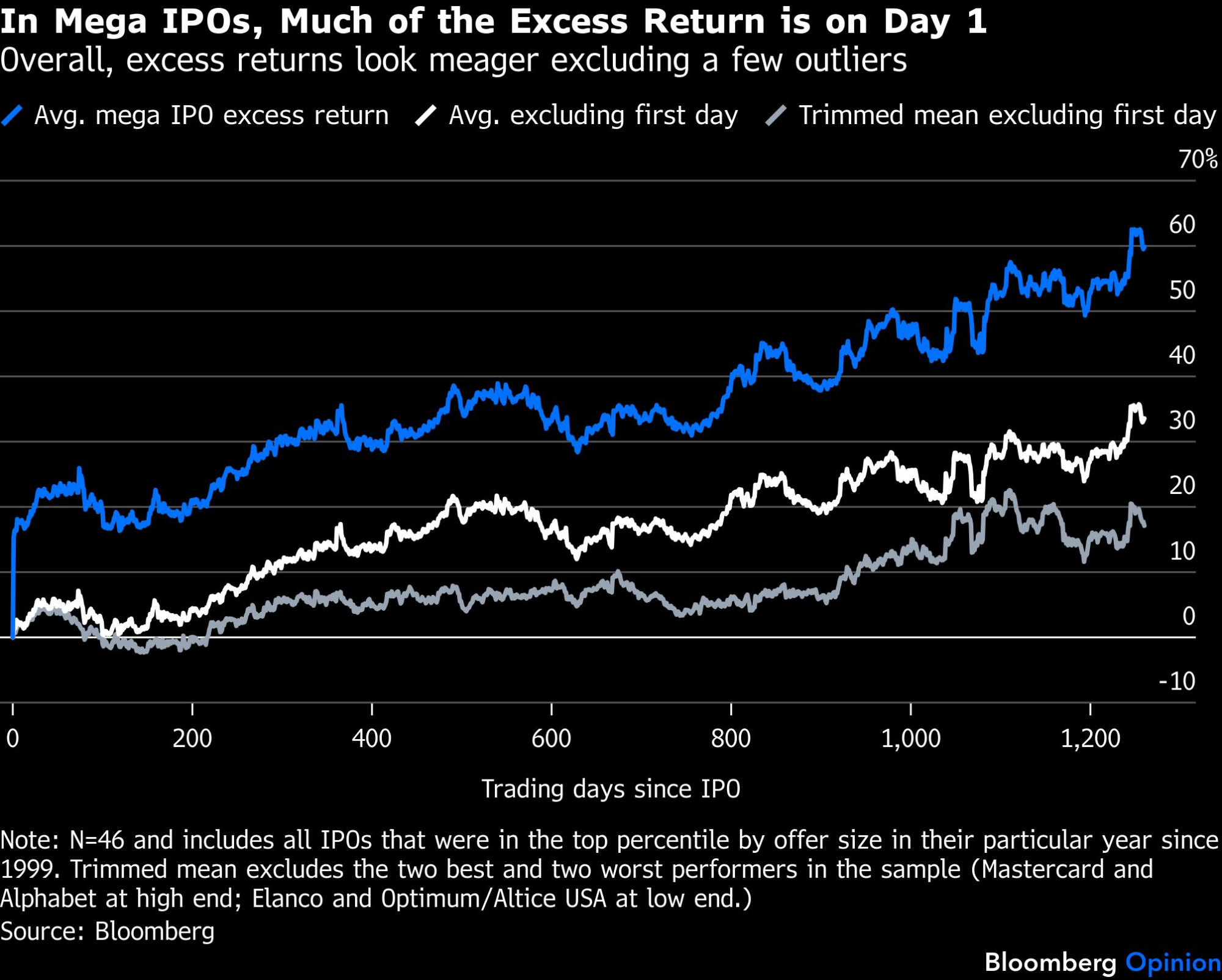 Među kompanijama koje svake godine spadaju u gornji percentil po veličini ponude, prosečan višak prinosa tokom pet godina iznosio je oko 60 odsto (otprilike 9,8 odsto godišnje). To jeste odlično, ali veliki deo tog nadmašivanja dolazi već prvog dana trgovanja. Statistika je dodatno "napumpana" ekstremnim izuzecima kao što su Mastercard Inc. (2006) i Alphabet Inc. (2004). Kada se koristi korigovana srednja vrednost i isključi "skok" prvog dana, nadmašivanje pada na oko 17 odsto (3,2 odsto godišnje). I po tom kriterijumu, ove akcije obično pronalaze svoj ritam tek u četvrtoj ili petoj godini.