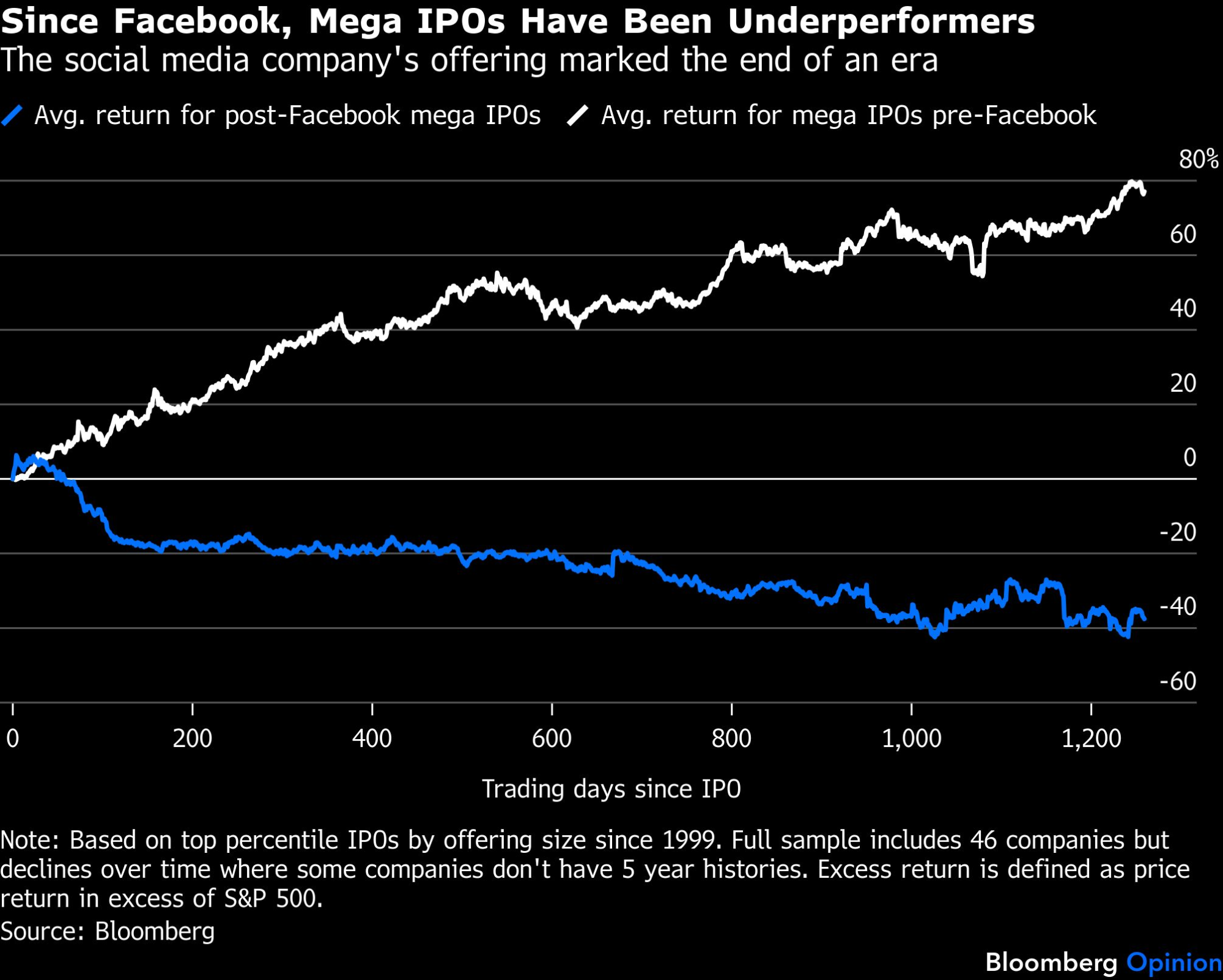 Nije ni čudo što mali investitori koji nemaju pristup rizičnom kapitalu često imaju osećaj da je igra sve više nameštena. U proseku, veliki IPO-ovi su zaostajali za tržištem od trenutka Facebook prekretnice.