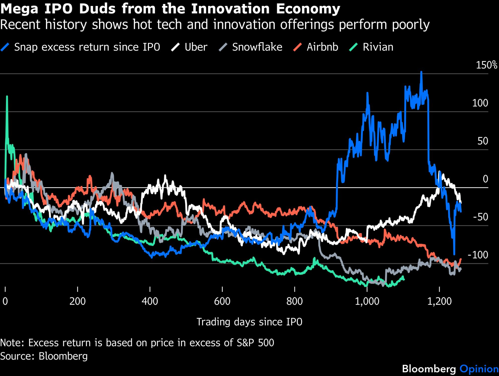 Doduše, post-Facebook generacija velikih IPO-ova je relativno mala i uključuje kompanije kao što su Athene Holding Ltd. (penzioni servisi) i Elanco Animal Health Inc. (veterinarski lekovi) koje zapravo nisu uporedive sa atraktivnim tehnološkim akcijama. Evo reprezentativnijeg uzorka najvećih tehnoloških i tehnološki srodnih IPO-ova iz poslednjih godina kako biste detaljnije videli to zaostajanje. Pouzdano su razočaravali u prvih pet godina svog javnog života.