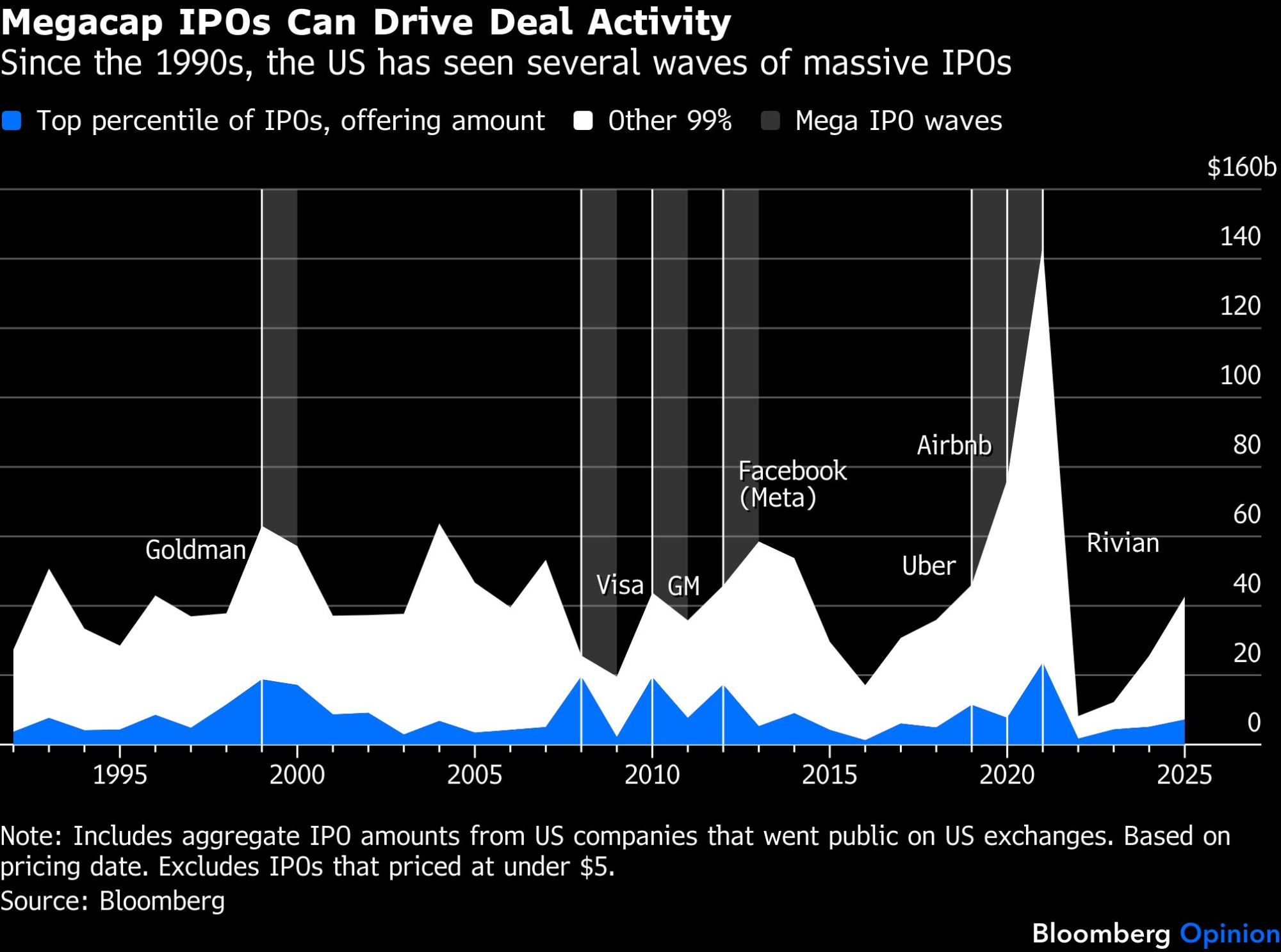 Podaci vremenskih serija sugerišu da smo imali nekoliko značajnih perioda procvata velikih IPO-ova. Postojao je period 1999-2000. na vrhuncu dot-com balona, a kasnije i velike kreditne kartične kompanije 2006. i 2008. godine. Tu je bila i ponuda General Motors Co. uz podršku vlade 2010. godine; zatim Facebook trenutak 2012; kao i niz u periodu 2019-2021. koji je uključivao Uber Technologies Inc. i Airbnb Inc.