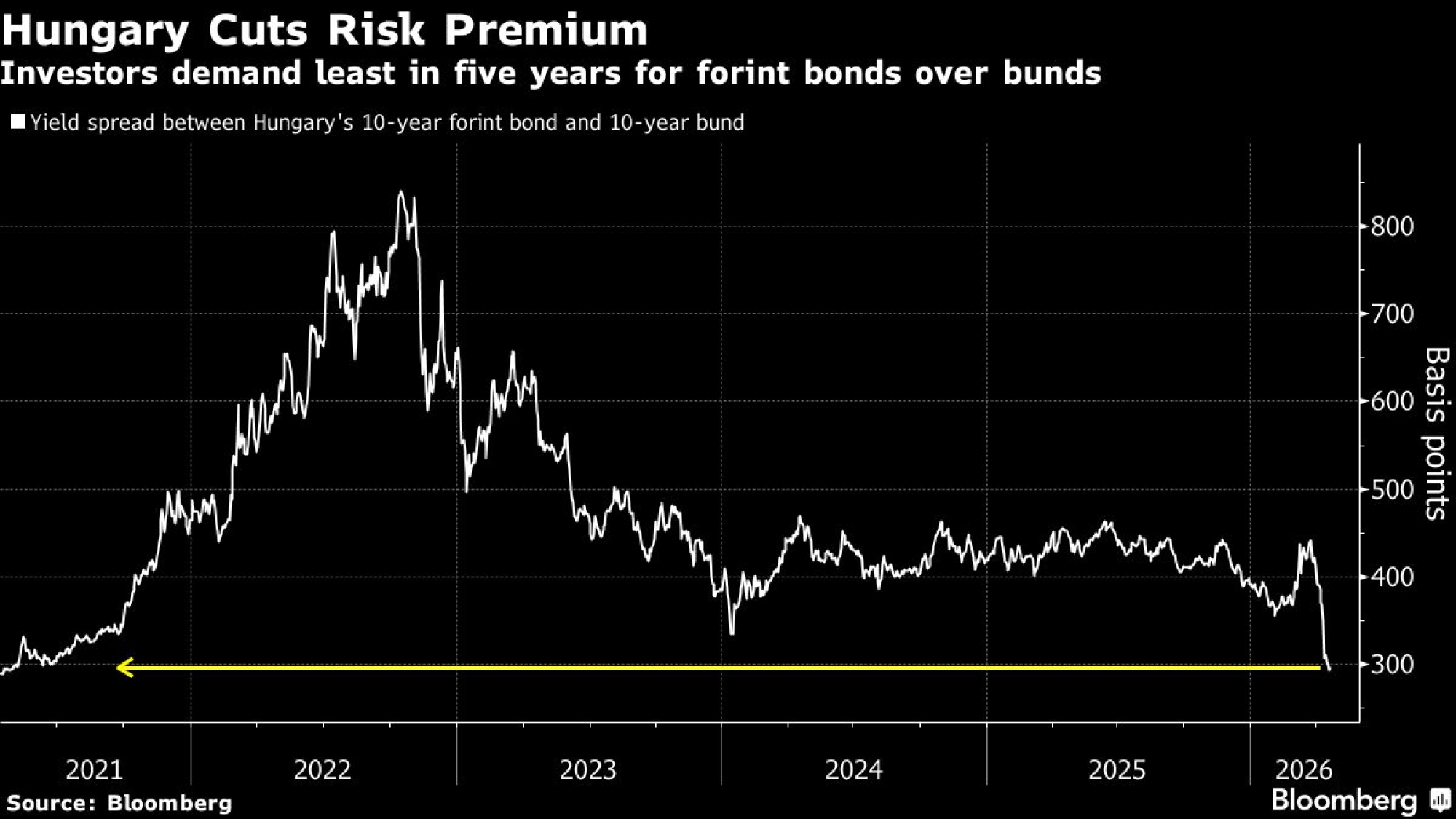 Prinos na mađarsku desetogodišnju obveznicu u lokalnoj valuti pao je za 150 baznih poena u poslednje četiri nedelje, smanjujući razliku u odnosu na slične nemačke obveznice, referentni instrument evrozone, najniže u poslednjih pet godina.