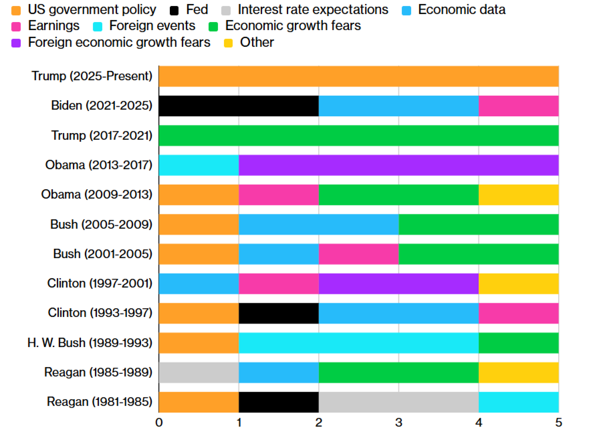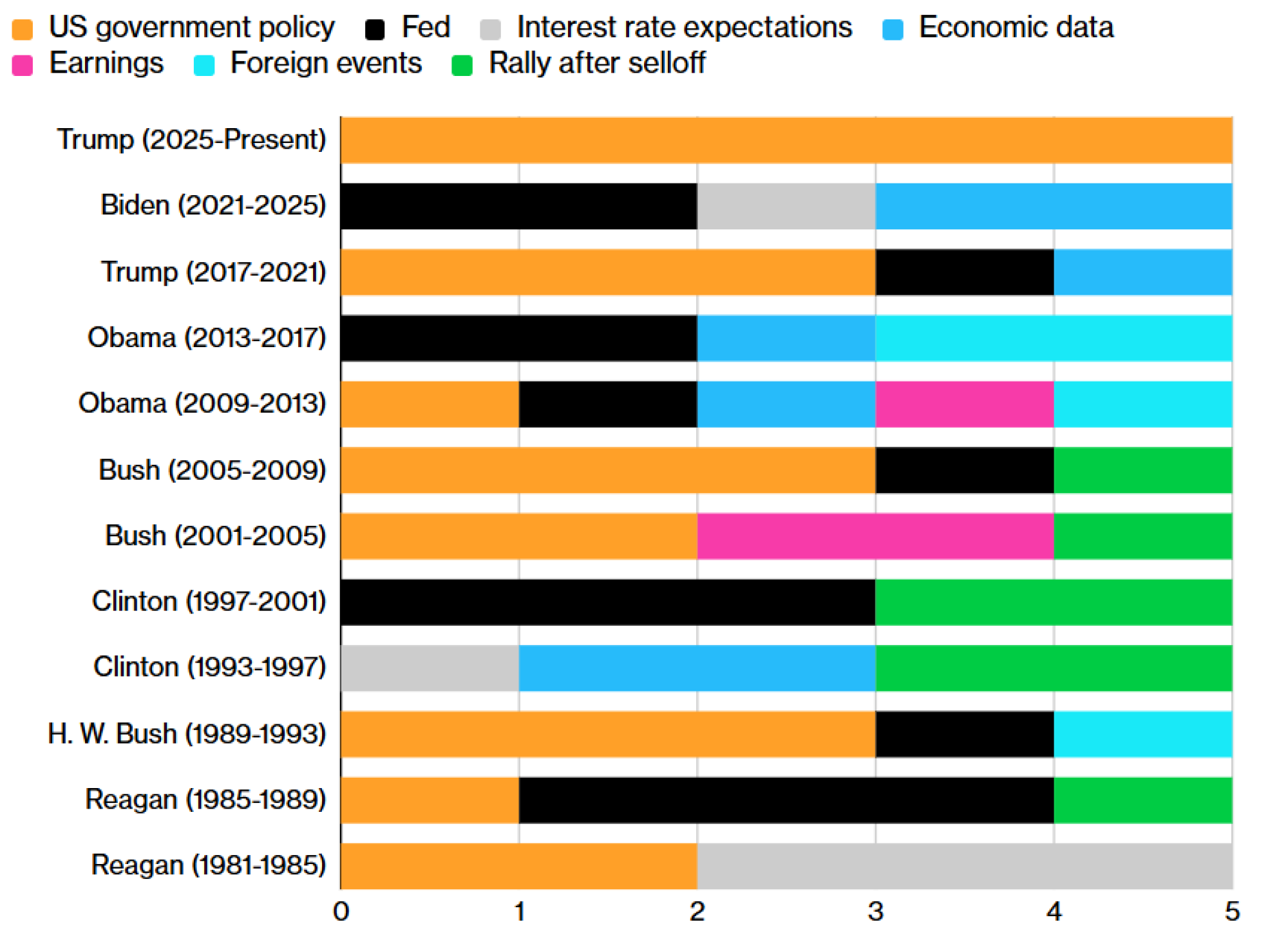 Od stupanja na funkciju prošlog januara, Trumpovi komentari novinarima u improvizovanim okupljanjima u Ovalnom kabinetu i na formalnim konferencijama za štampu, kao i njegove objave na društvenim mrežama, bili su glavni pokretač iza pet najboljih i najgorih dana indeksa S&P 500, prema analizi Fundstrat Research. To je uticaj kakav nijedan savremeni američki lider nije imao. Nijedan drugi predsednik nije orkestrirao ovoliko najboljih i najgorih dana kroz dvanaest administracija koje sežu unazad do predsednika Ronald Reagan 1981. godine.