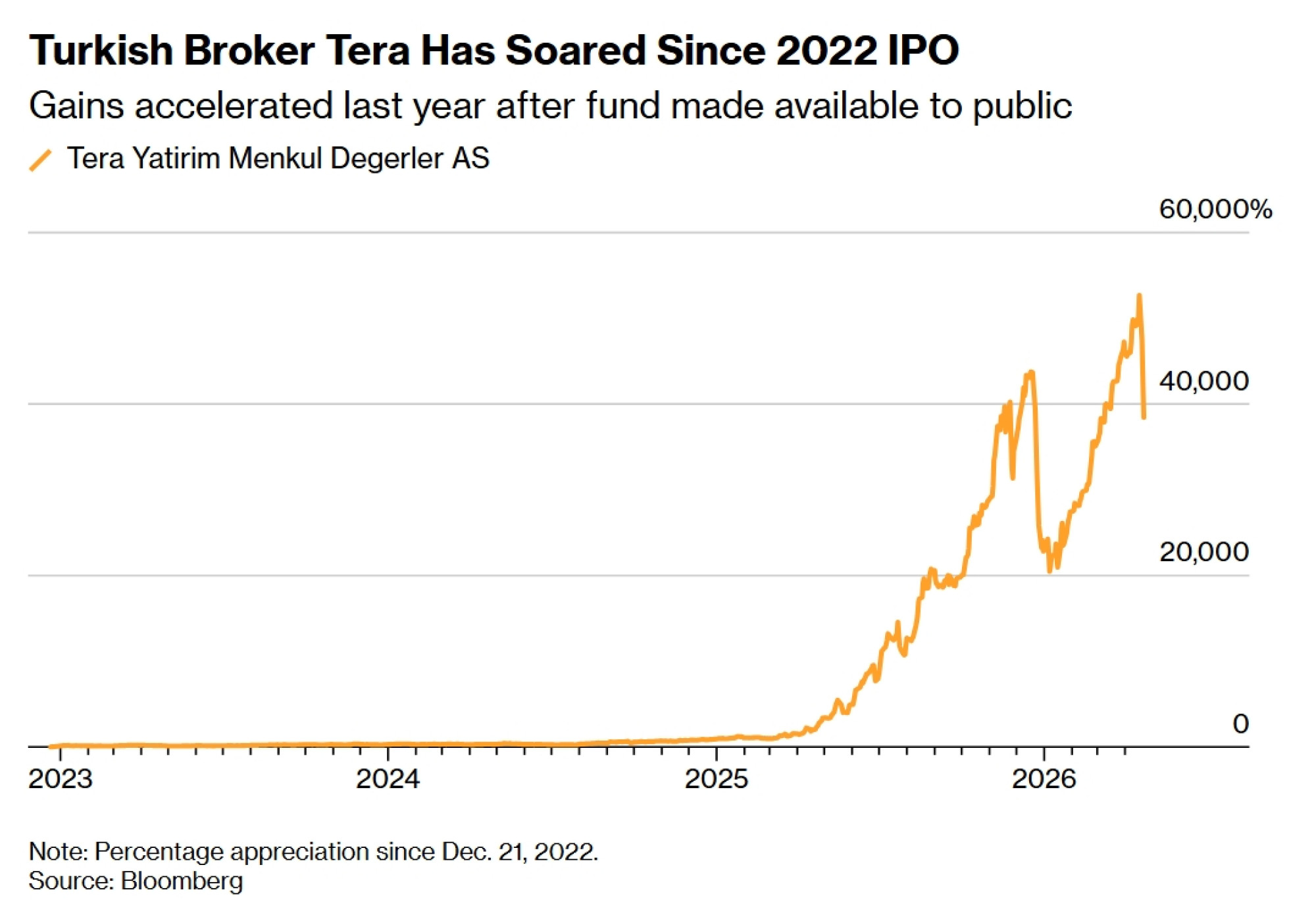 Kako su meseci prošle godine prolazili, dobici na akcijama kompanije Tera Yatirim Menkul Degerler AS samo su se nastavili nizati, iznova i iznova, u neverovatnim iznosima - 54 odsto, 108 odsto, 61 odsto, 73 odsto. Čak i u Turskoj, koja je dugo žarište spekulativnih manija, sama brzina i razmere ovog skoka - koji sada iznosi gotovo 40.000 odsto od inicijalne javne ponude Tere 2022. godine - zapanjili su investitore i podstakli fascinaciju finansijskom alhemijom koja ga je, čini se, pokretala.