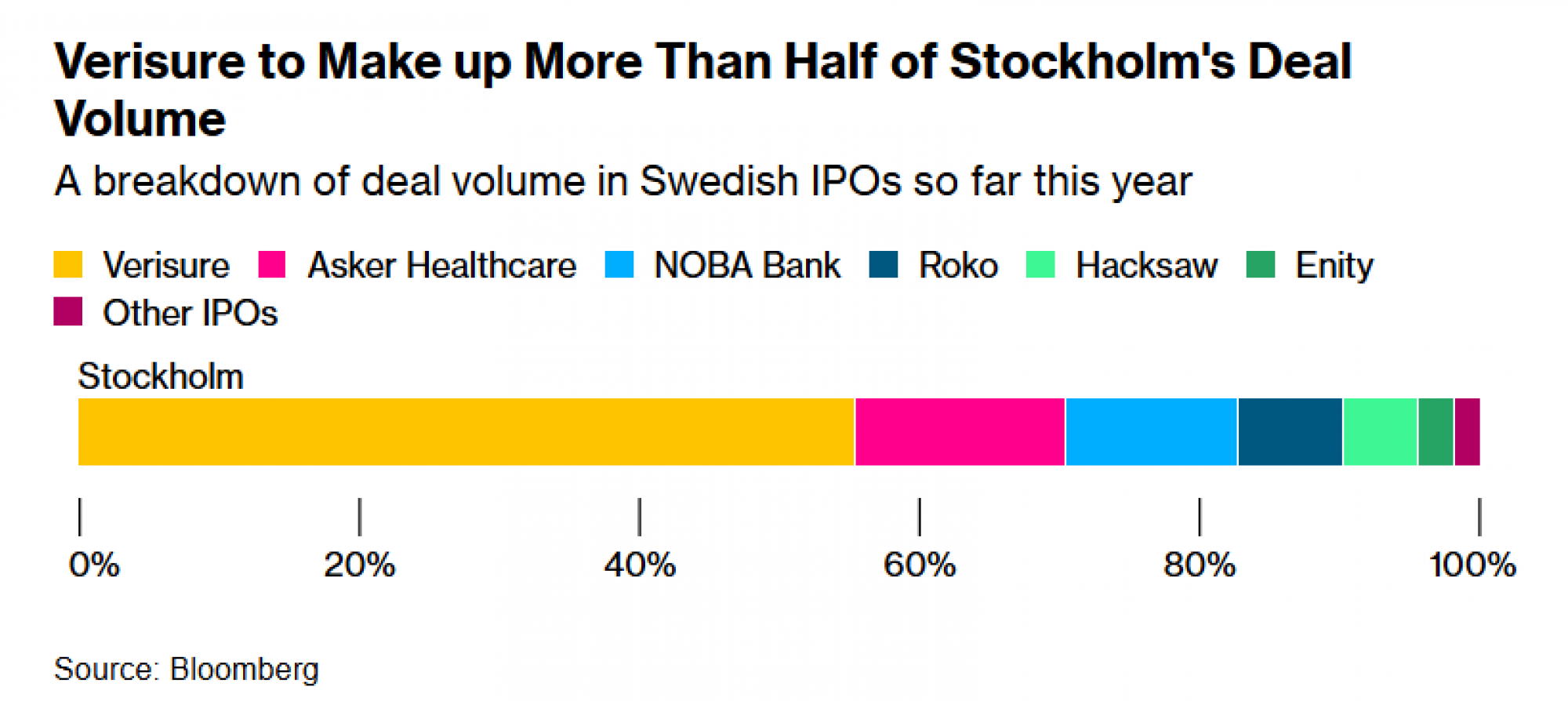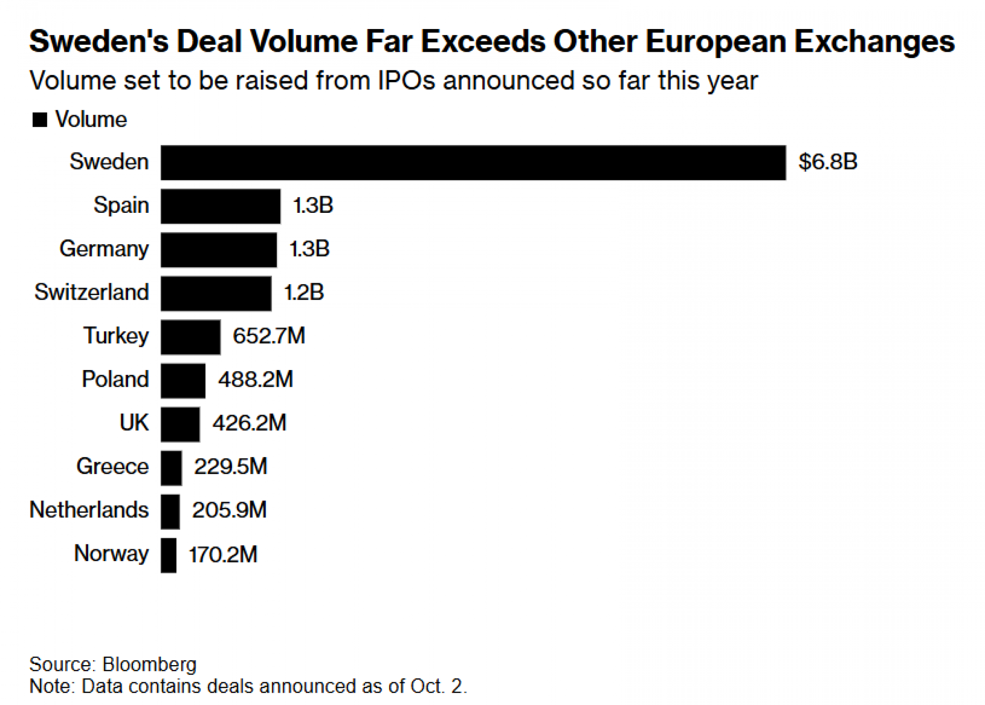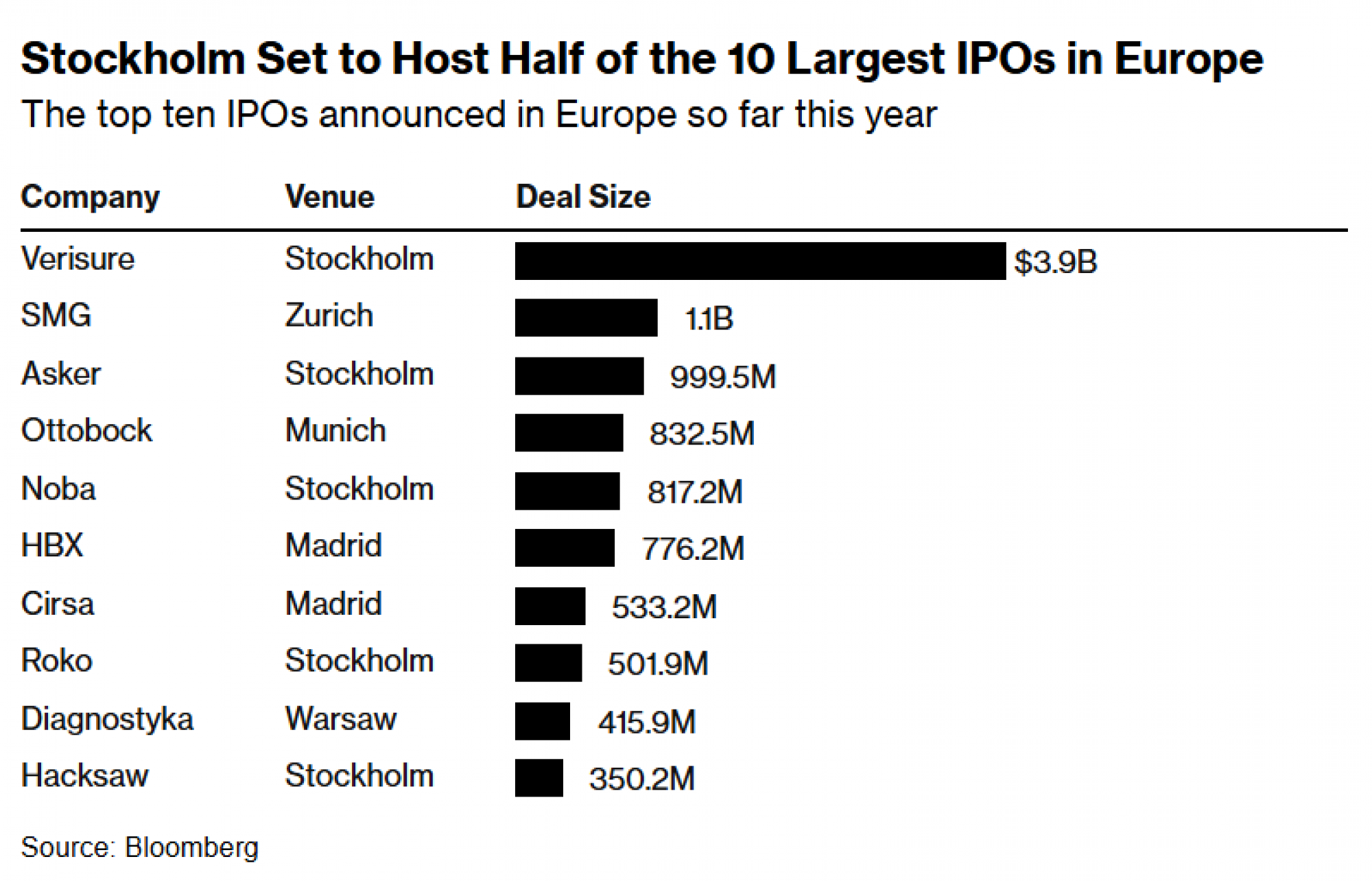 Švedska prestonica je na putu da prikupi 6,8 milijardi dolara putem inicijalnih javnih ponuda (engl. initial public offering - IPO) ove godine, što je više nego bilo gde na kontinentu, i ugostiće najveće evropsko kotiranje od 2022. kada firma za bezbednost Verisure Plc izađe na tržište sledeće nedelje. Na svetskom nivou, to je peto najpopularnije odredište, posle Sjedinjenih Američkih Država (SAD), Kine, Hongkonga i Indije. Reč je o iznenađujućem uspehu za tržište koje je veličine trećine londonskog tržišta.