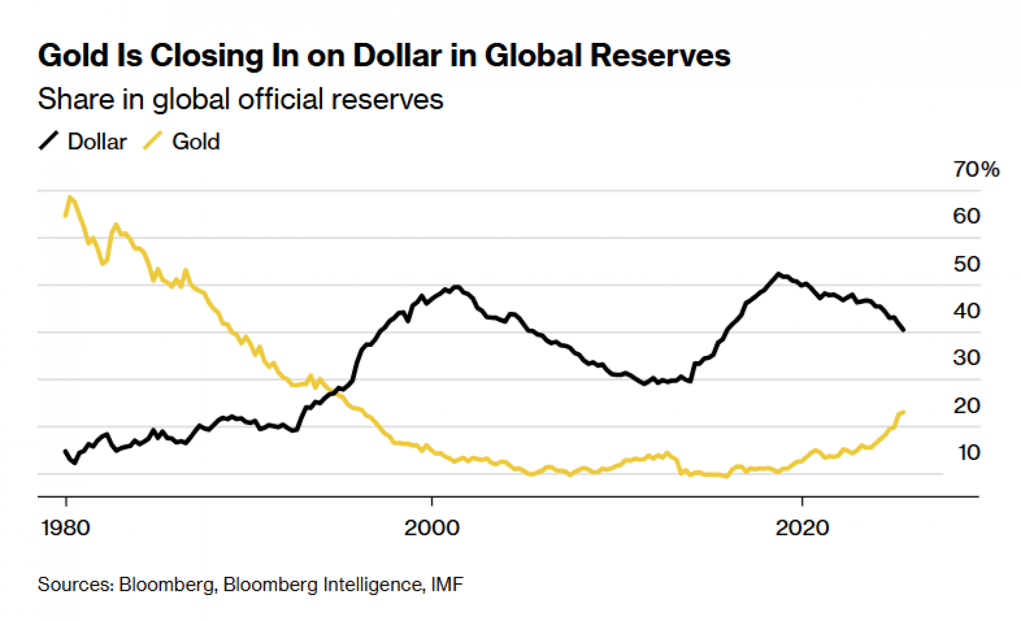 "Ako menadžeri rezervi nastave da se povlače ne samo iz dolara već i iz svih fiducijarnih valuta, zlato bi moglo nastaviti da raste", napisali su stratezi Eurizona prošle nedelje. "Ako bi zlatne rezerve centralnih banaka dostigle nivo dolarskih, zlato bi, pod istim uslovima, moglo dostići cenu od 8.500 dolara. Zašto da ne?"