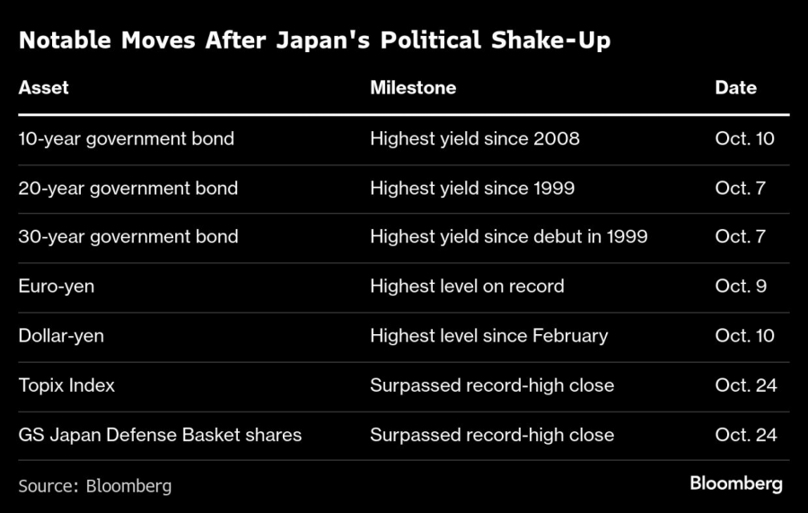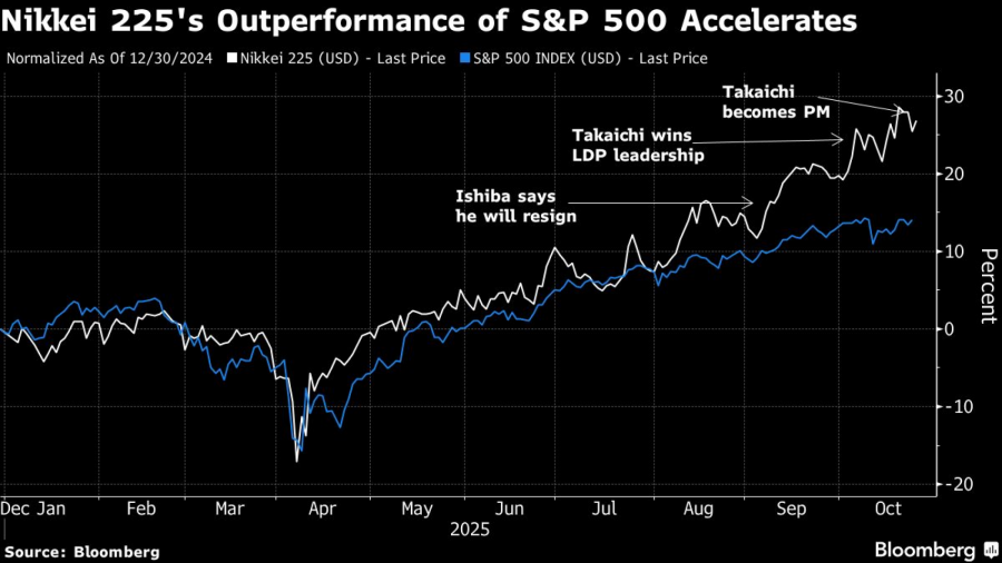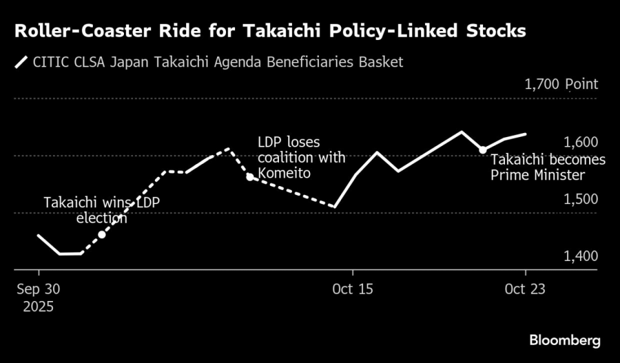 Otkako je fiskalno obazrivi Shigeru Ishiba najavio da se povlači s funkcije premijera, indeks Nikkei 225 porastao je za 15 odsto, nadmašivši rast S&P 500 indeksa, jer su investitori ugradili očekivanja o naslednici koja će trošiti više. Takaichi je obećala veća ulaganja u odbranu, tehnologiju, sajber bezbednost i nuklearnu energiju, što je podiglo vrednost korpe akcija koje bi imale koristi od njene administracije za više od 10 odsto od izbora novog lidera Liberalno-demokratske partije, čime su nadmašene performanse šireg indeksa Topix.