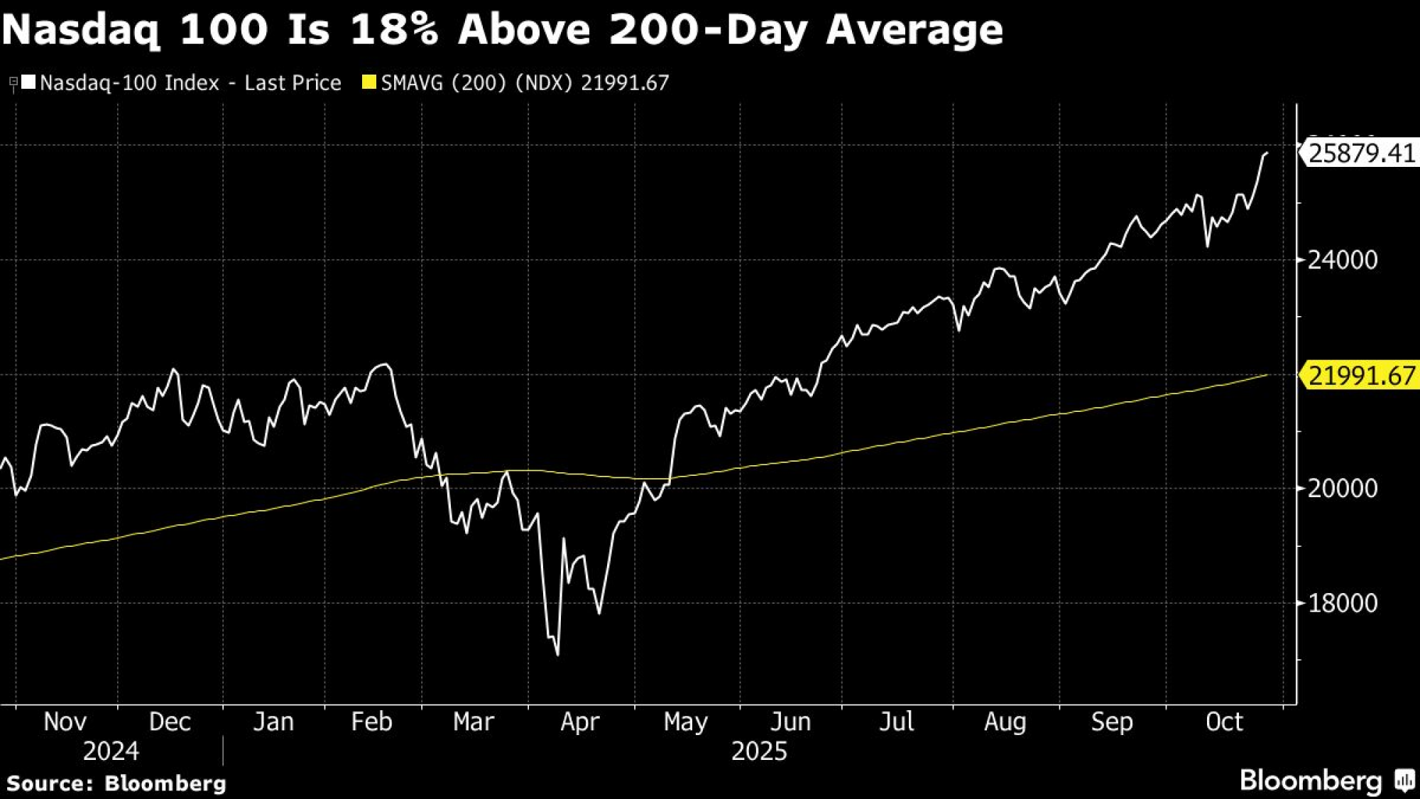 Tehnološki orijentisan Nasdaq 100 sada je gotovo za 18 odsto iznad svoje 200-dnevne pokretne prosečne vrednosti, naveo je Peter Boockvar, autor izveštaja The Boock Report. To je najviše od jula 2024. godine, kada je indeks dostigao 20 odsto pre korekcije od 13 odsto.