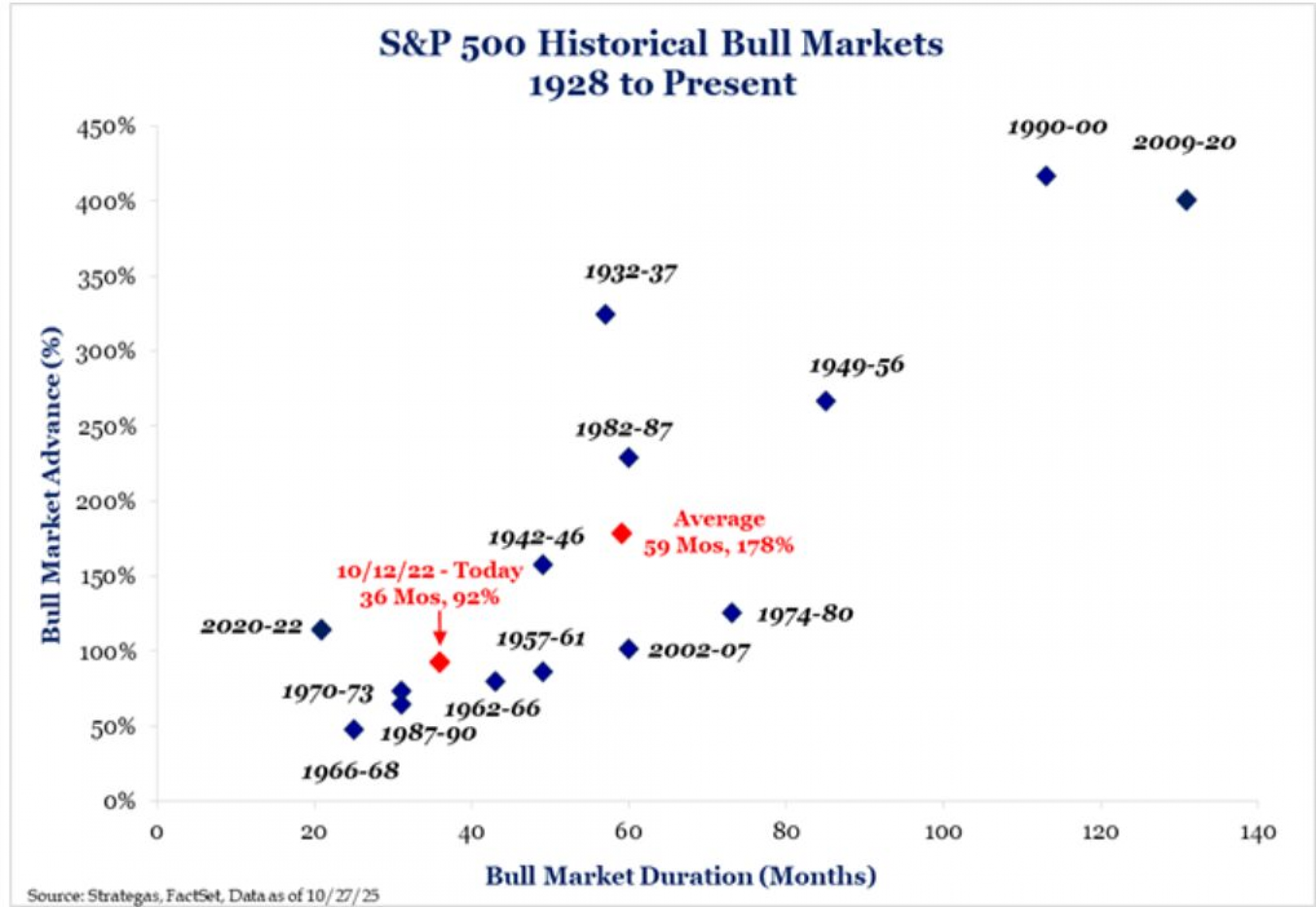 Kako se tržište bika sada približava četvrtoj godini, Ryan Grabinski iz Strategasa kaže da je počeo da dobija sve više pitanja o tome kako trenutni rast sa niskih nivoa istorijski stoji u poređenju sa ranijim ciklusima.