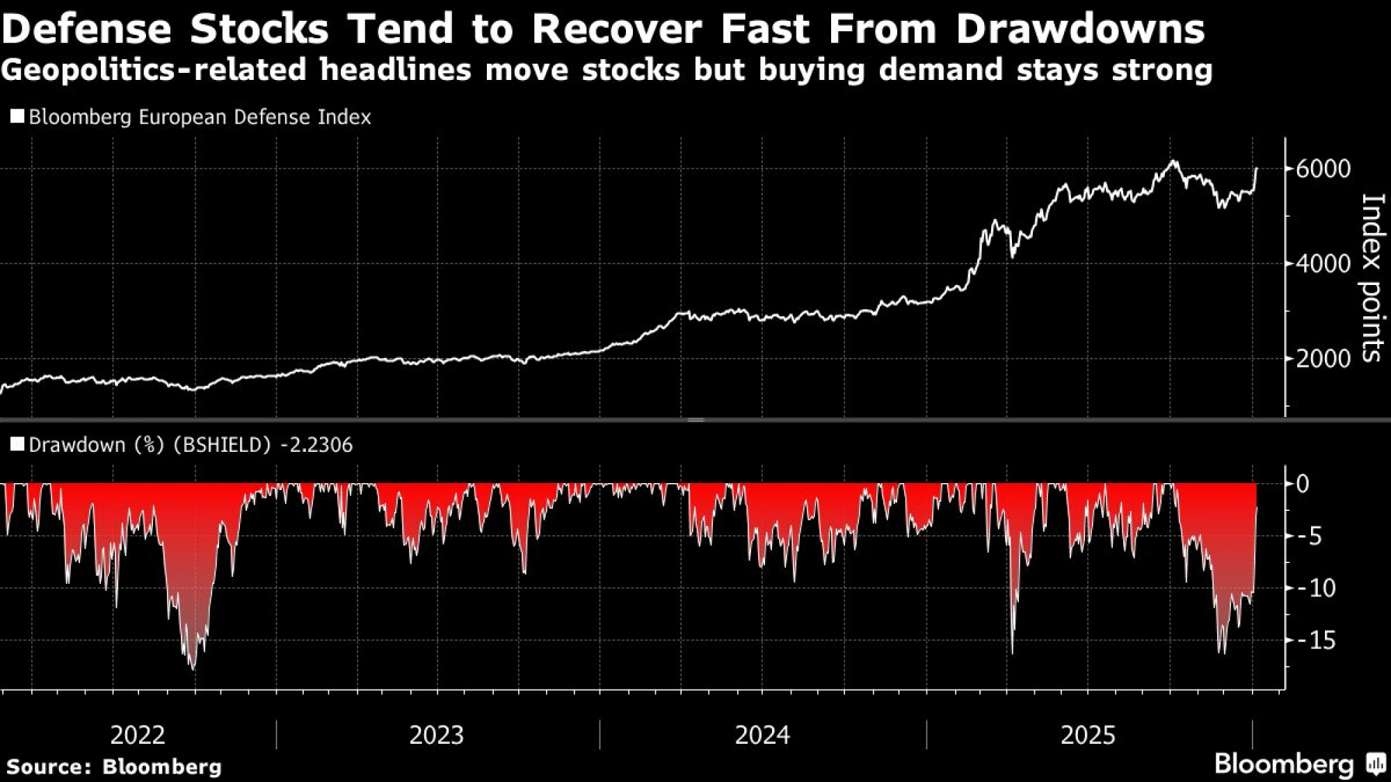 Bloombergov indeks odbrane skočio je za 73 odsto tokom 2025. godine, jer je povećanje državnih izdvajanja podstaklo rast akcija. Sektor je brzo postao ključan za ukupno tržište, generišući oko 12 odsto prinosa indeksa Stoxx Europe 600 prošle godine, što je najveći doprinos posle banaka.