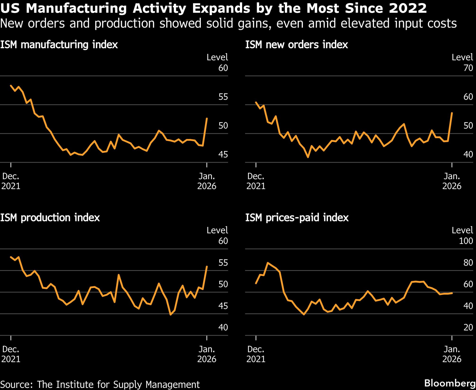 Indeks industrijske proizvodnje Instituta za upravljanje nabavkom (Institute for Supply Management, ISM) porastao je sa 47,9 na 52,6, pokazuju podaci objavljeni u ponedeljak. Vrednosti iznad 50 označavaju ekspanziju, a najnoviji rezultat premašio je sve prognoze u anketi koju je Bloomberg sproveo među ekonomistima.