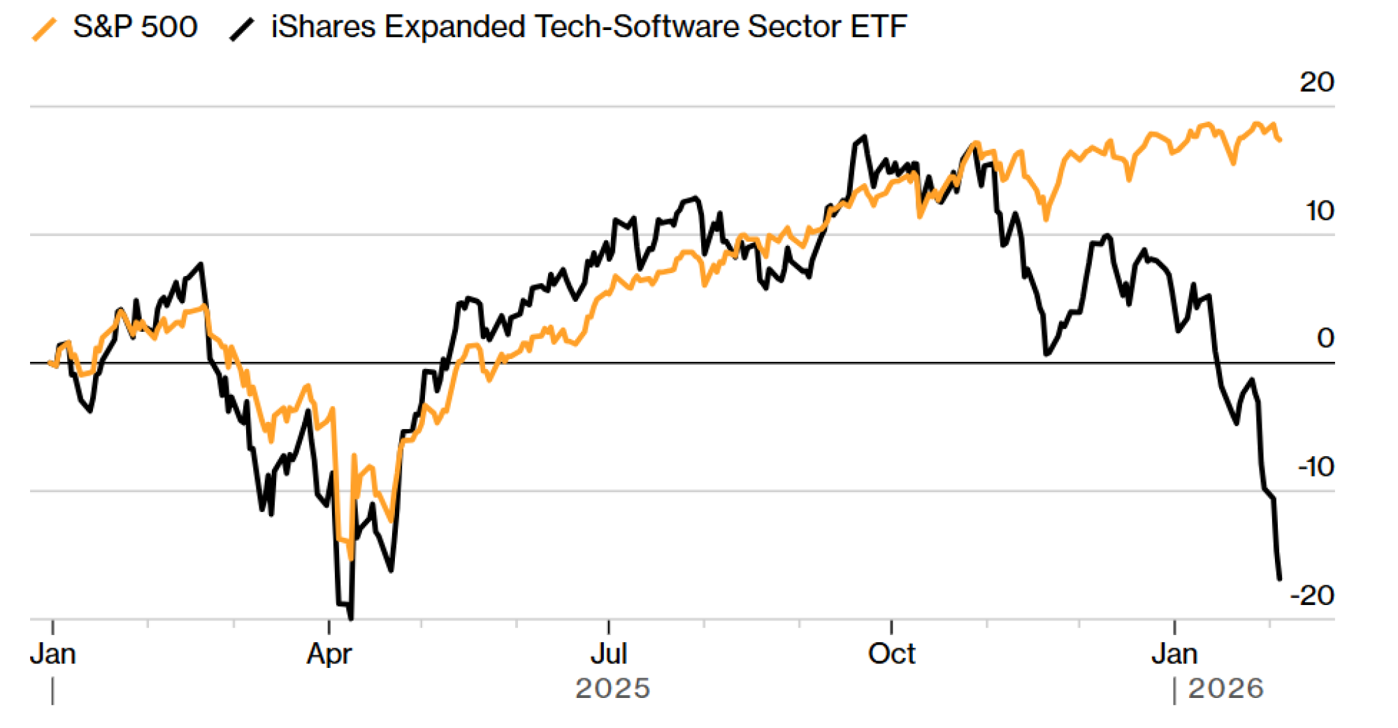 S&P 500 je izgubio 0,8 odsto. Nasdaq 100 je probio svoj 100-dnevni pokretni prosek, nivo koji neki tehnički analitičari smatraju nagoveštajem daljih gubitaka. IShares Expanded Tech-Software Sector ETF pao je 2,5 odsto. Pažljivo praćeni pokazatelj proizvođača čipova potonuo je 5,5 odsto.