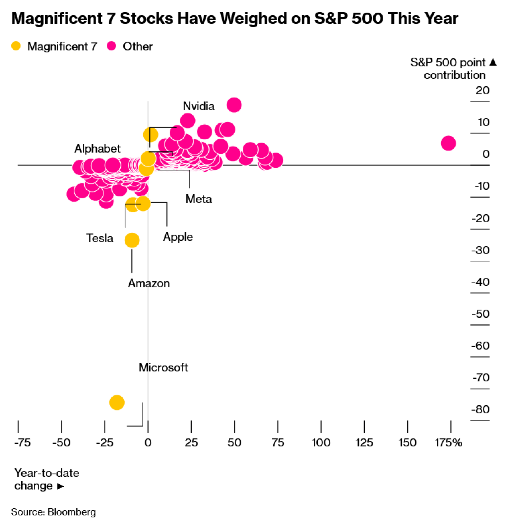 Nije samo Nvidia u problemima. Tehnološki giganti iz grupe "veličnstvenih sedam", koji su najviše doprineli rastu akcija u poslednjih nekoliko godina, već mesecima stagniraju. Bloombergov indeks te grupe pao je za gotovo jedan procenat od početka četvrtog tromesečja, što je u tom periodu slabiji rezultat od indeksa S&P 500.
