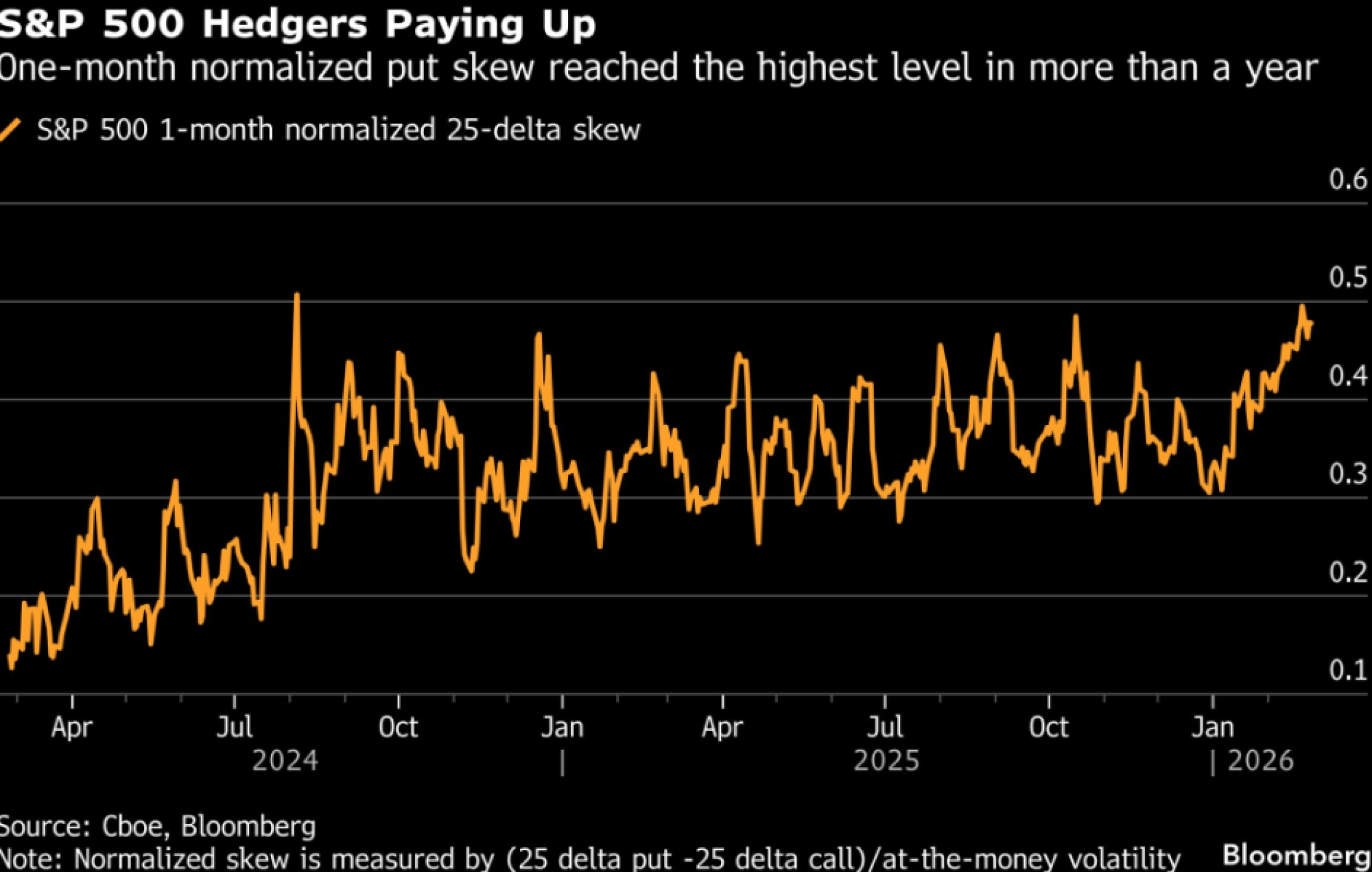 Put-call skew, pokazatelj cene zaštite od pada u odnosu na opklade na rast, prošle nedelje dostigao je najviši nivo u dve godine. Normalizovani dvomesečni skew na S&P 500 sada je blizu gornje granice raspona u poslednjih pet godina.