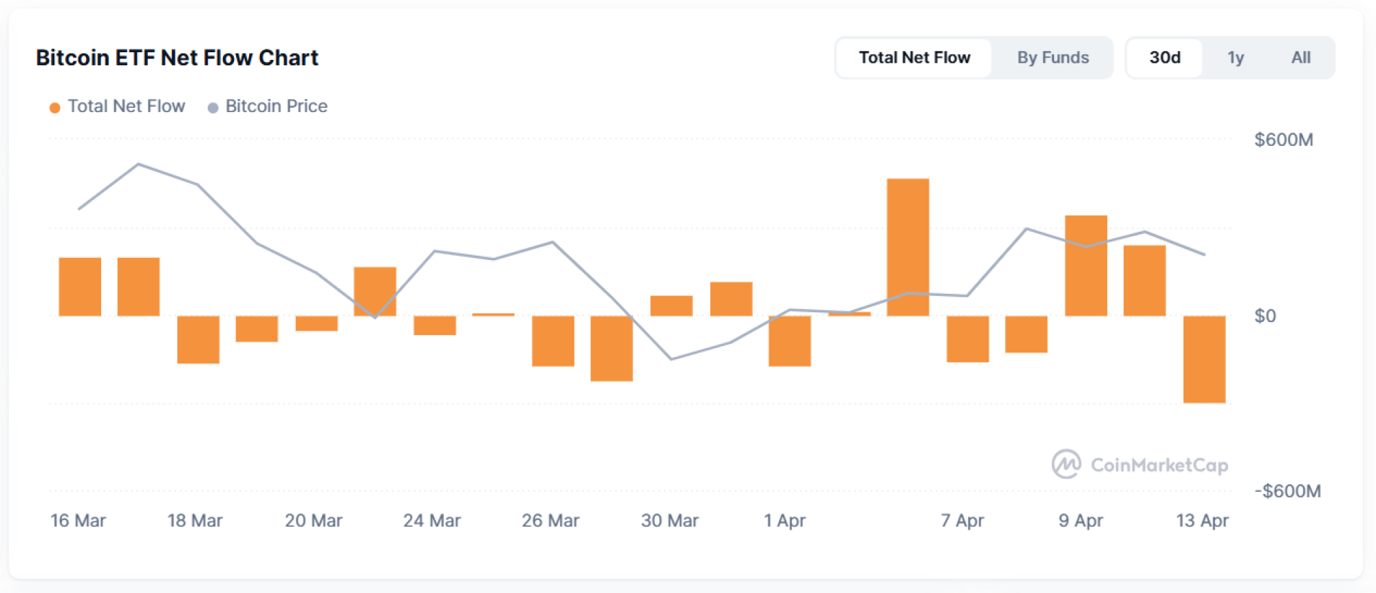 Ukupni neto tokovi u bitcoin ETF-ovima (narandžasti stupci) i cena bitcoina (siva linija) | Izvor: Coinmarketcap.com