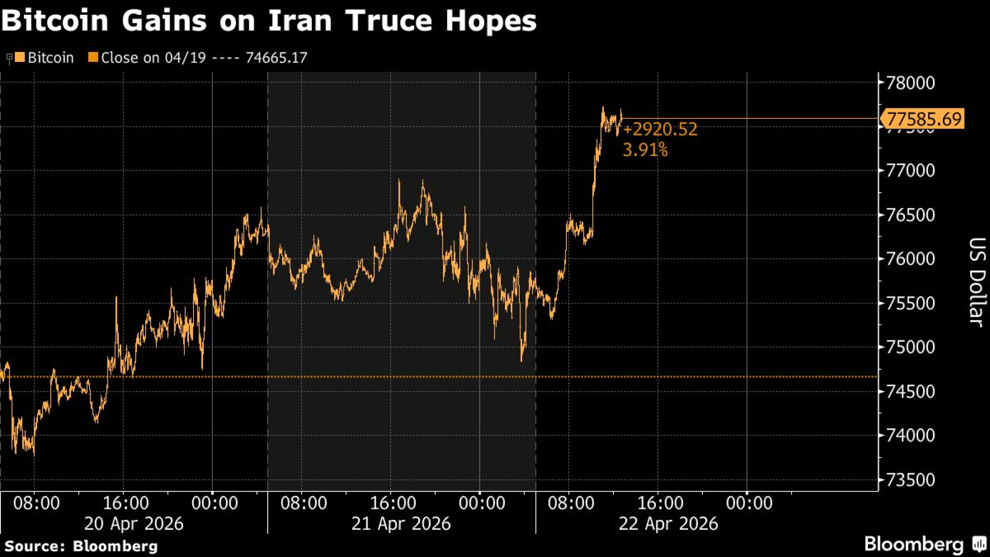 Bitcoin je dostigao najviši nivo od početka februara, probivši granicu od 78.000 dolara, nakon signala deeskalacije sukoba na Bliskom istoku i otvaranja Ormuskog moreuza.
