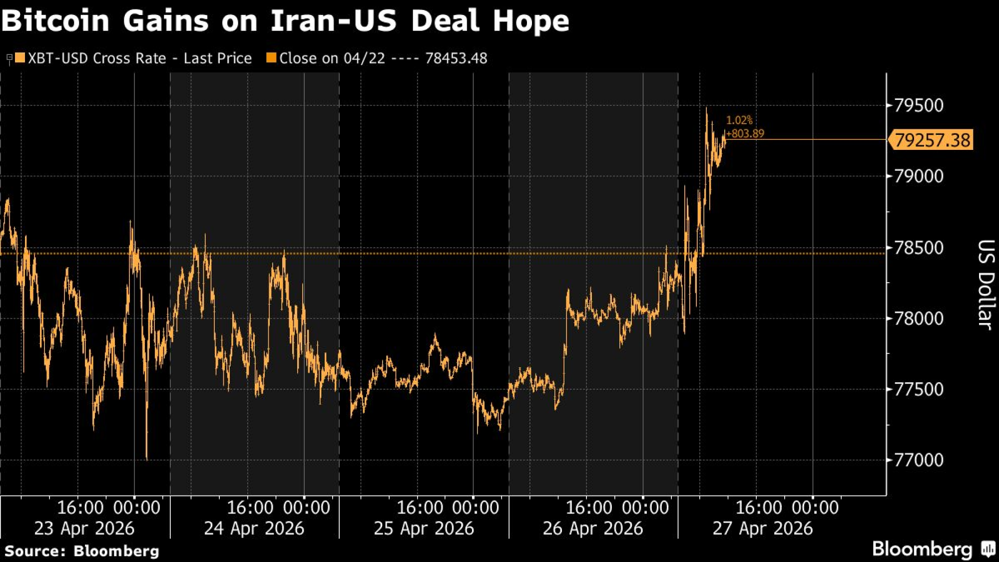 Bitcoin je u ponedeljak nastavio spor rast ka 80.000 dolara dok su investitori procenjivali najnovija dešavanja u sukobu između SAD i Irana oko Ormuskog moreuza.