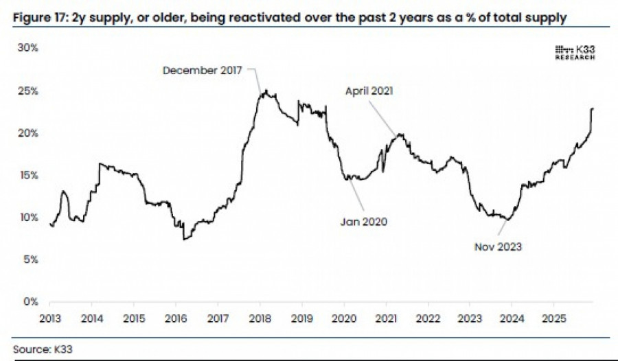 Ipak, Lunde smatra da bi prodaja dugoročnih vlasnika bitcoina mogla da se bliži kraju, jer se reaktivacija ponude približava pragu uočenom u istorijskim "on-chain" tokovima.