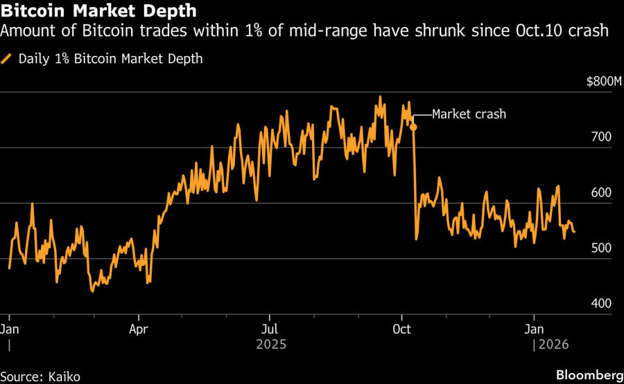 Dubina tržišta bitcoina, pokazatelj kapitala raspoloživog za apsorpciju velikih naloga, i dalje je više od 30 odsto ispod oktobarskog maksimuma, prema podacima Kaika. Poslednji put kada je likvidnost pala toliko duboko bilo je nakon kolapsa FTX-a 2022. godine.