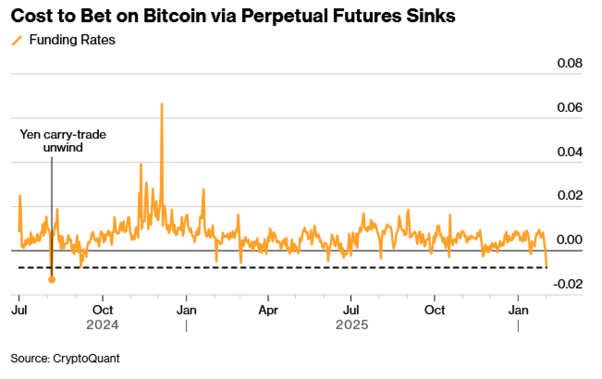 Trajni terminski ugovori na bitcoin, derivati koji nemaju rok dospeća i čine većinu obima trgovanja kriptovalutama, takođe najavljuju pesimističnije raspoloženje na tržištu. Stope finansiranja, koje pomažu da cene ugovora ostanu usklađene sa bitcoinom, postale su negativne i pale na najniži nivo još od masovnog povlačenja iz pozicija "yen carry trade" u avgustu 2024. godine, pokazuju podaci CryptoQuanta. Kada stope postanu negativne, trgovci sa kratkim pozicijama čine većinu tržišta i plaćaju onima koji drže duge pozicije kako bi zadržali svoje pozicije otvorenima.
