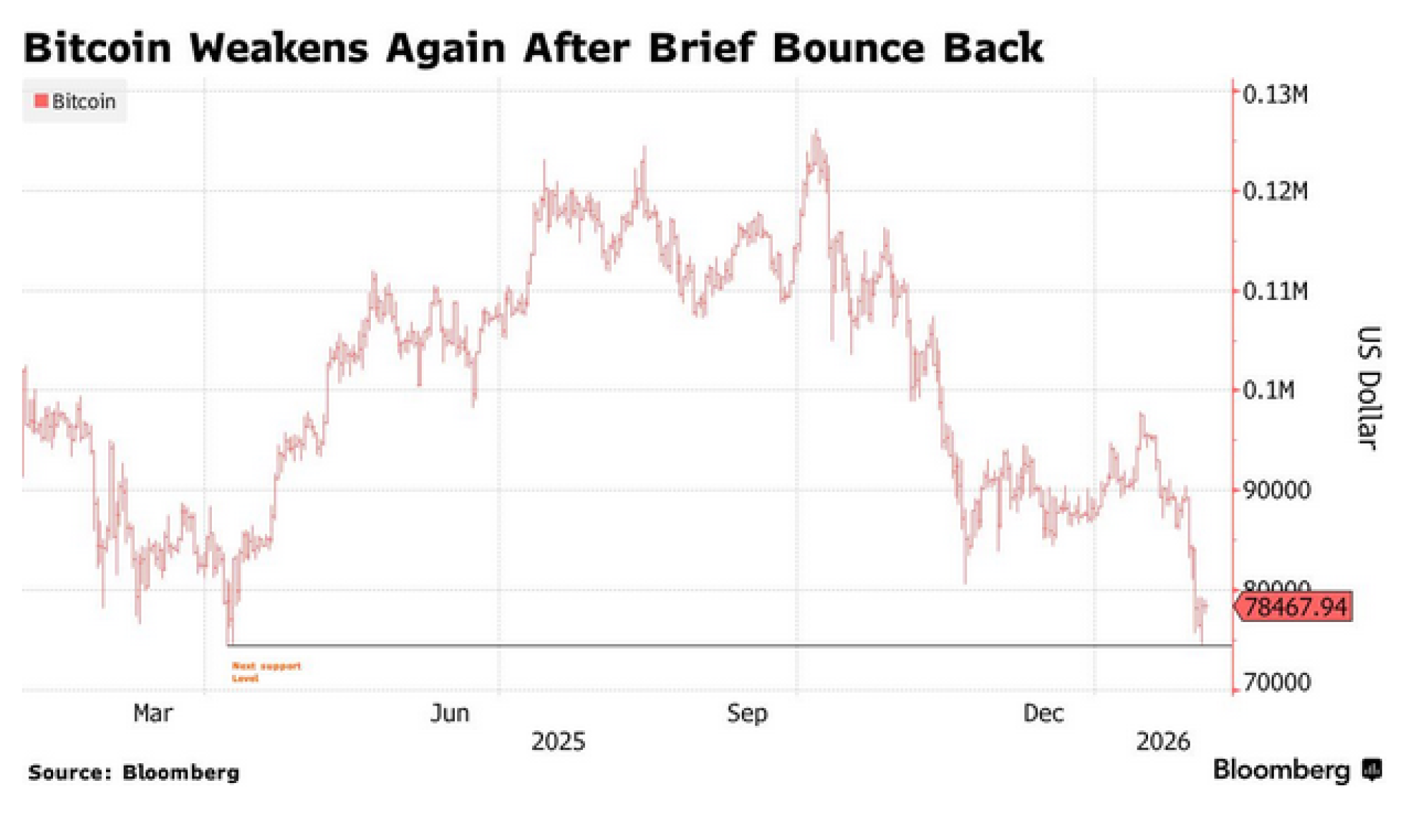 Trgovanje je uglavnom stagniralo do ranog popodneva u Singapuru, a izvorna kriptovaluta kretala se ispod 78.500 dolara tokom dana, nakon što ju je medveđe raspoloženje gotovo gurnulo na najniži nivo otkako se američki predsednik Donald Trump vratio u Belu kuću pre nešto više od godinu dana.