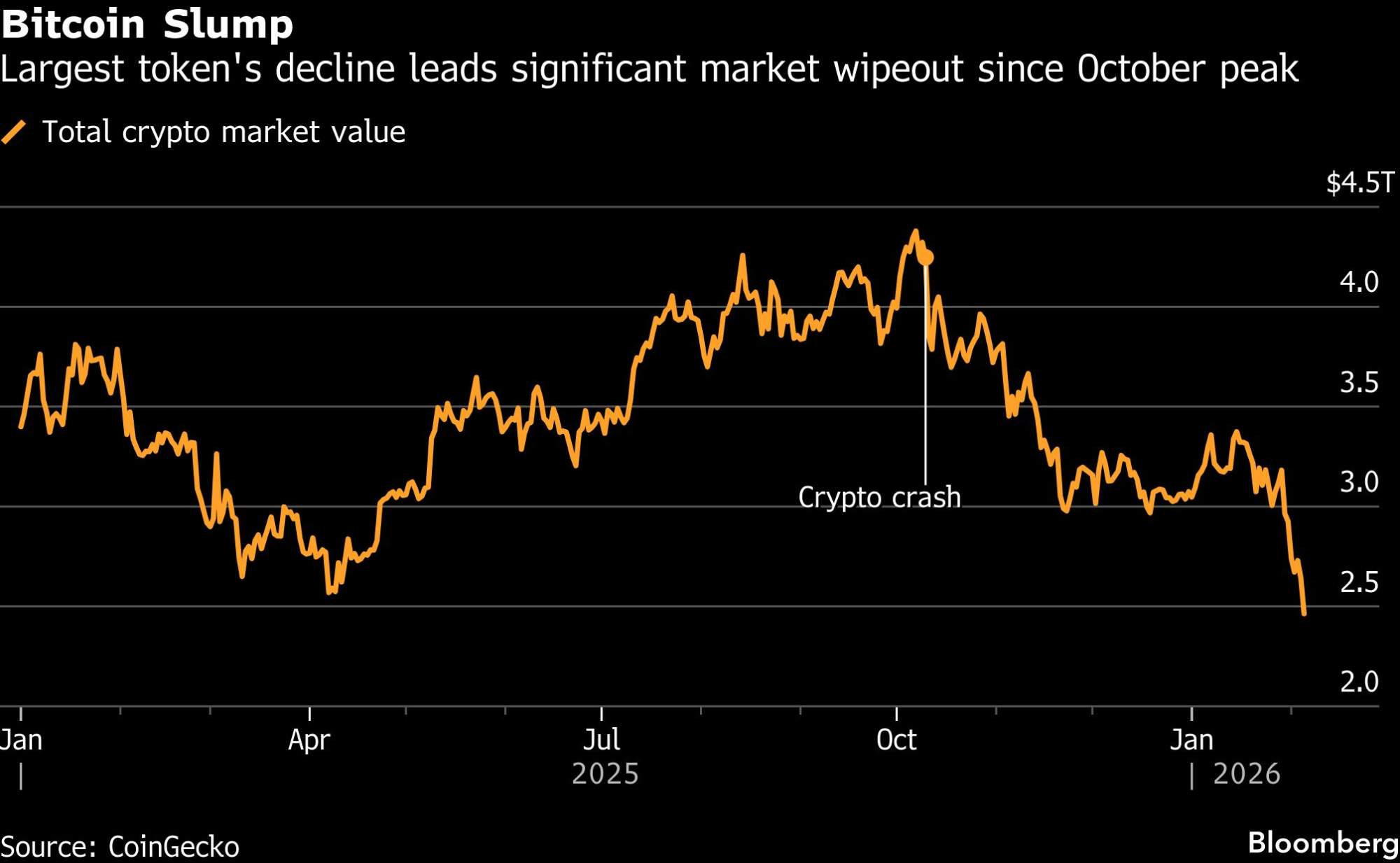 Token je pao za 4,9 odsto na 69.049 dolara u ranom trgovanju u Njujorku, dostižući najniži nivo od novembra 2024. Slabljenje se ubrzava čak i dok se zlato i srebro povlače sa nedavnih maksimuma koji su ranije naveli spekulativne trgovce da se okrenu od digitalnih imovina. Bitcoin je sada za oko 45 odsto ispod oktobarskog maksimuma, dok su veliki kupci poput ETF-ova (engl. exchange-traded fund - fond kojim se trguje na berzi) i kreatora trezora digitalnih imovina smanjivali uloge.