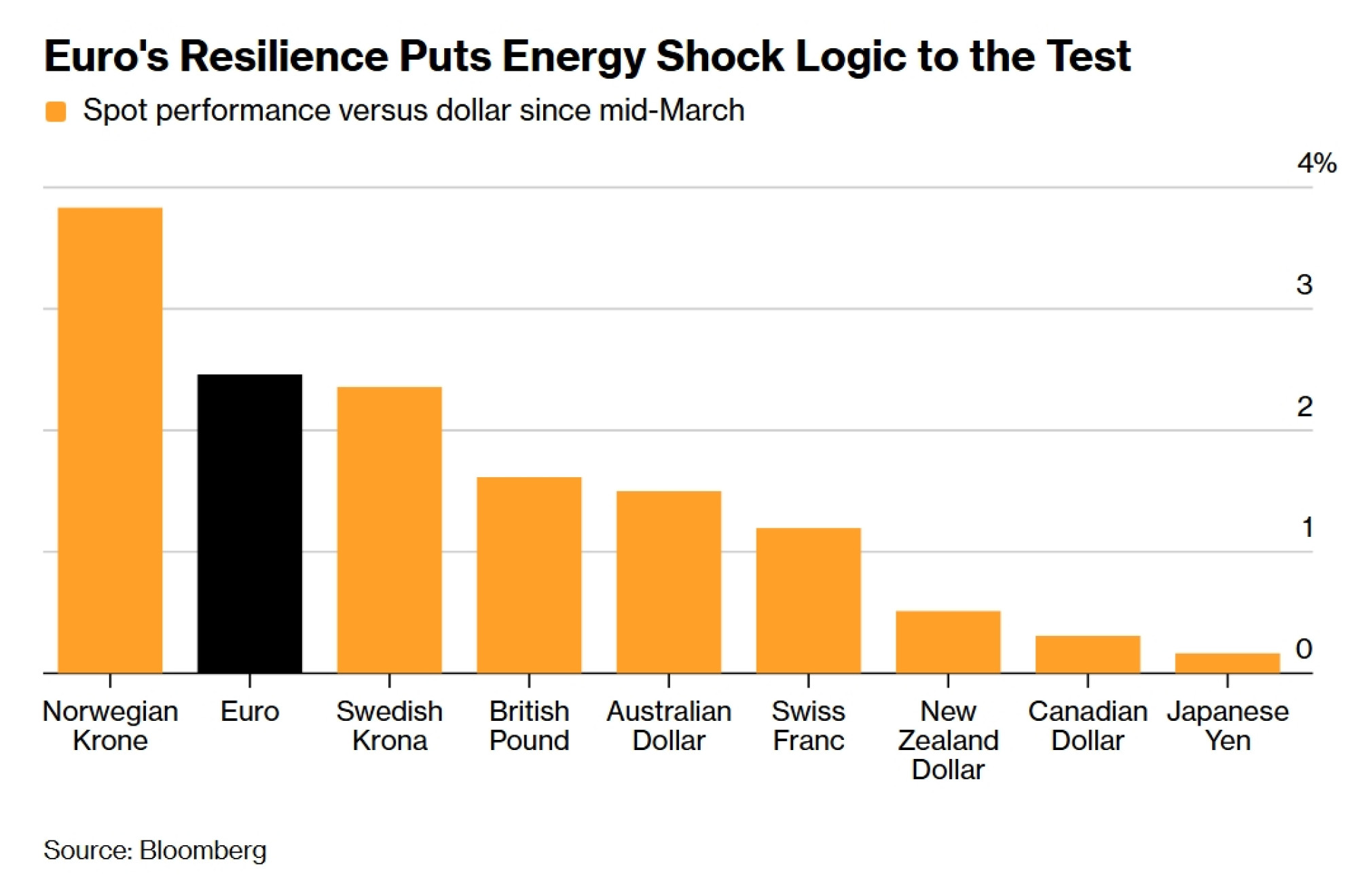 Evro je druga najuspešnija valuta G-10 u odnosu na dolar tokom proteklog meseca, prkoseći očekivanjima da će energetski šok izazvan ratom na Bliskom istoku pogoditi evropsku ekonomiju i povući valutu naniže.