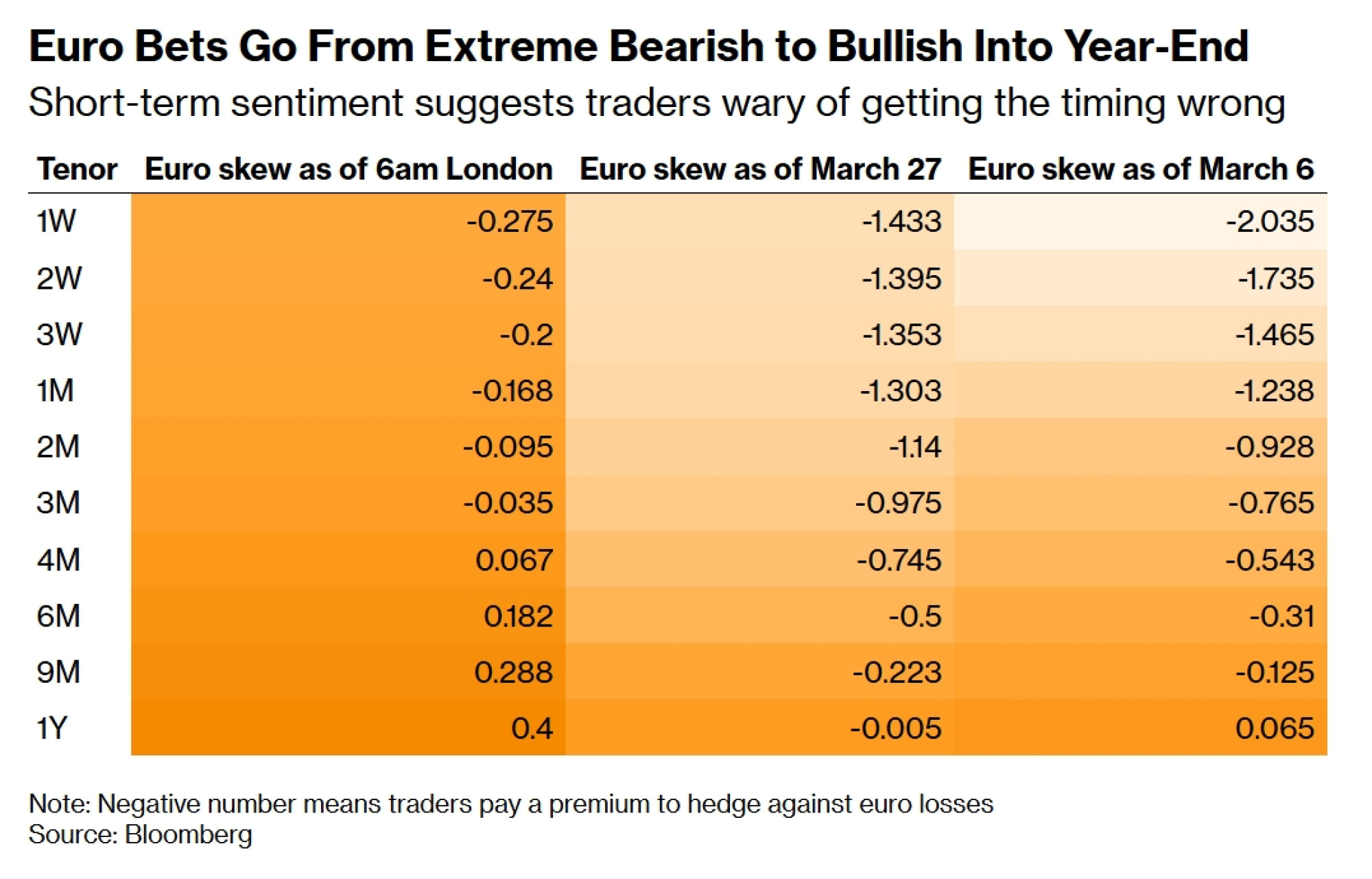 Troškovi zaštite tokom narednih mesec dana ostaju prigušeni, uz impliciranu volatilnost blizu šest odsto, što je ispod ovogodišnjih vrhunaca iznad devet odsto i ispod dugoročnog proseka. Istovremeno, trgovci su optimistični u pogledu izgleda valute. To se vidi u kretanju cena jednogodišnjih risk reversal ugovora, koji mere koliko je skupo kupiti u odnosu na prodati valutu na tržištu opcija.
