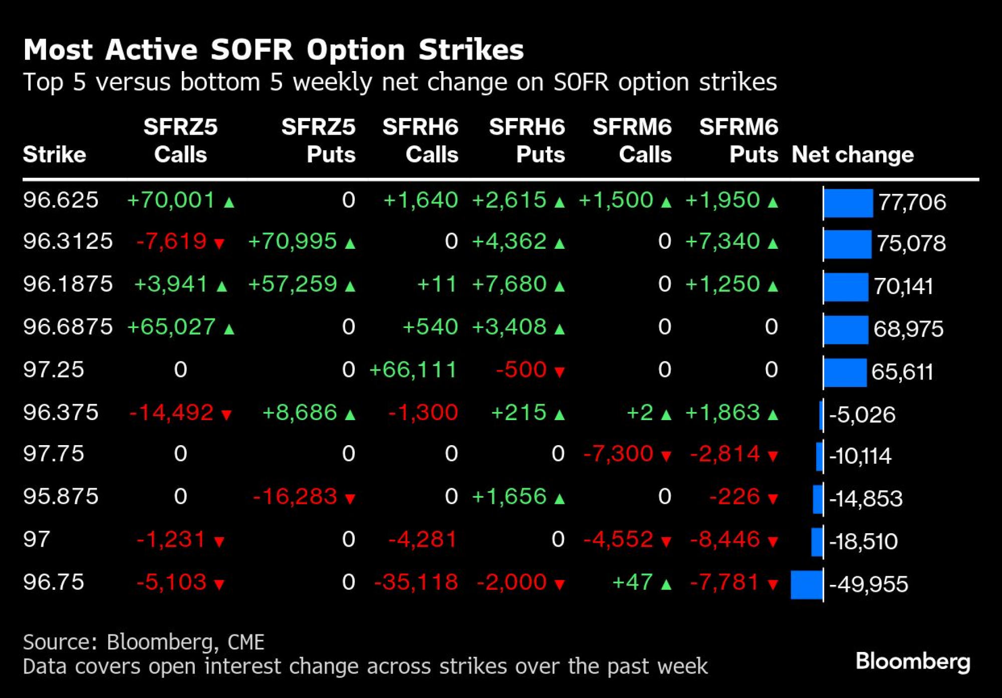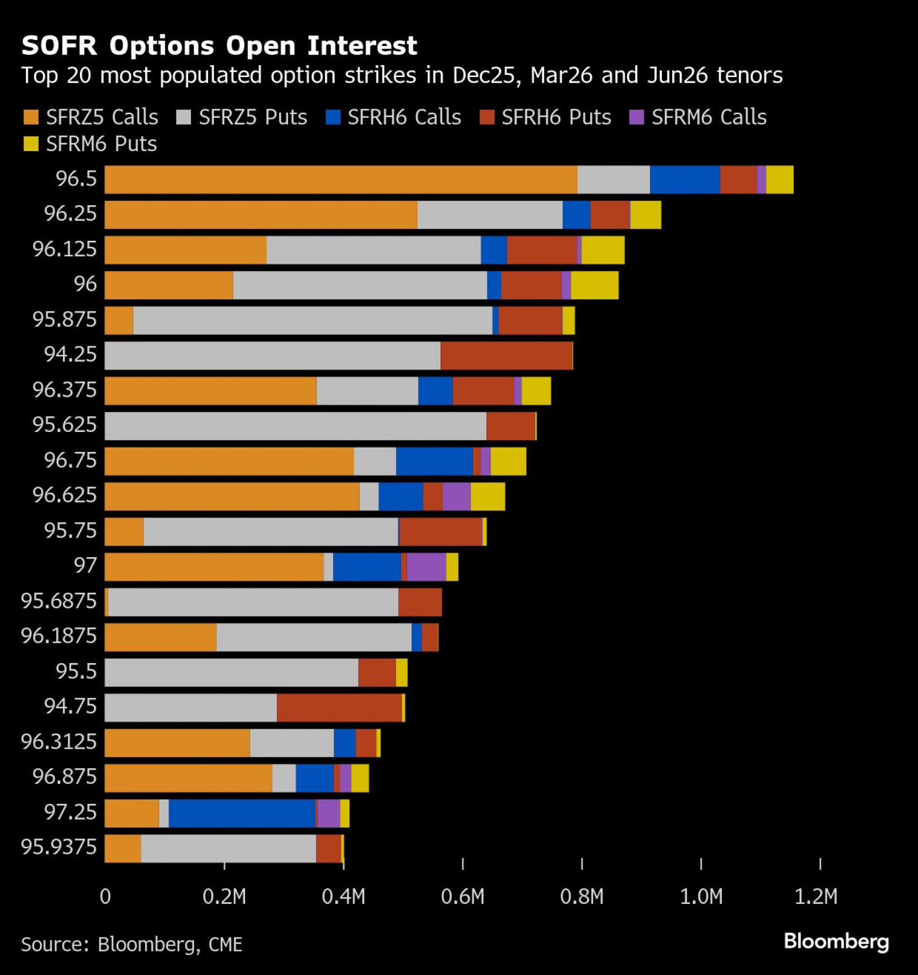 Na tržištu SOFR opcija sa ročnostima u decembru 2025, martu 2026. i junu 2026. nivo od 96,50 ostaje najaktivniji i beleži najveći obim trgovine kupovnim opcijama za decembar 2025, gde se trenutno nalazi većina otvorenih pozicija. Nivo od 96,25 takođe je bio veoma korišćen, sa značajnim brojem kupovnih opcija za decembar 2025.