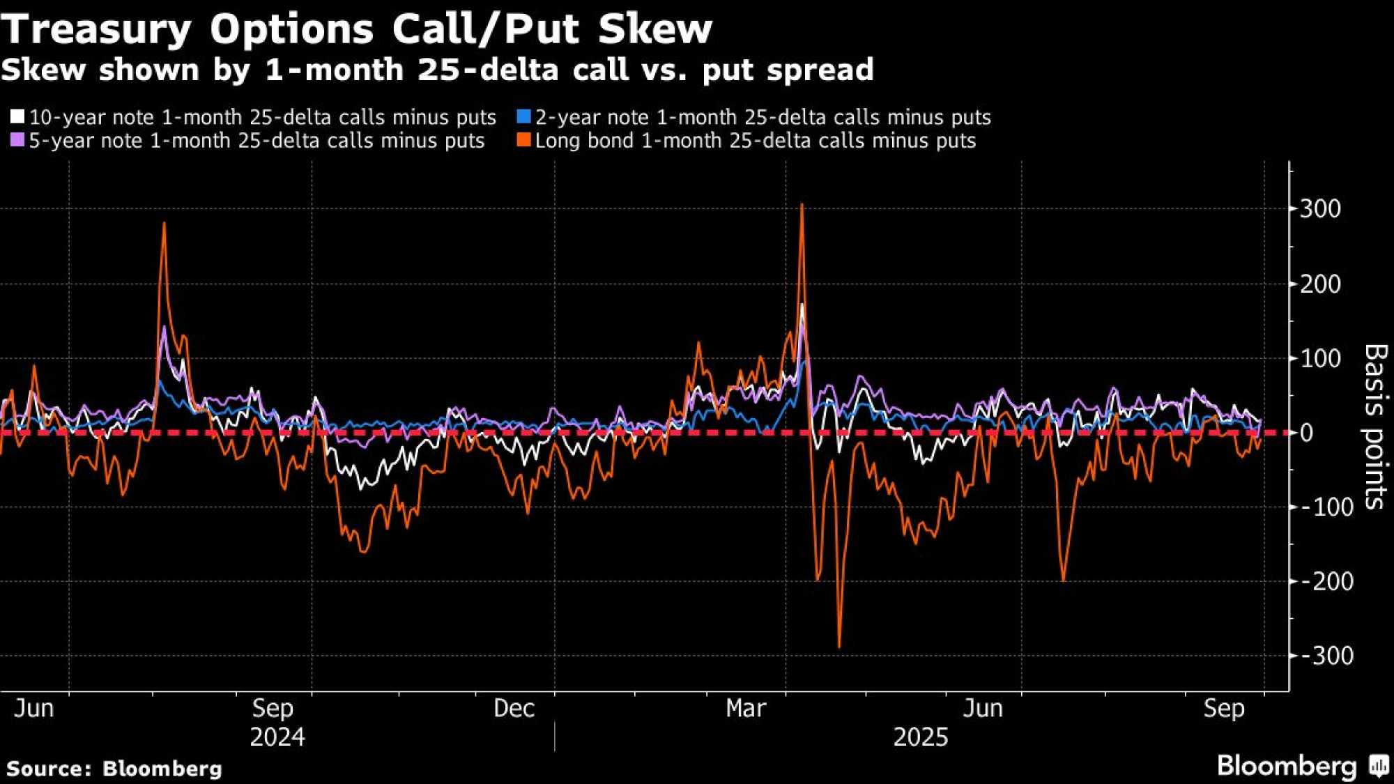 Nagib opcija za američke trezorske obveznice i dalje se kreće oko neutralnog nivoa duž krive, pri čemu je na dugom kraju nedavno došlo do prelaska sa prednosti prodajnih na kupovne opcije početkom septembra. Nedavni tok trgovine opcijama pokazuje povećanu potražnju za opcijama koje ciljaju pad 10-godišnjih prinosa na četiri odsto i niže, koristeći niz decembarskih kupovnih opcija.