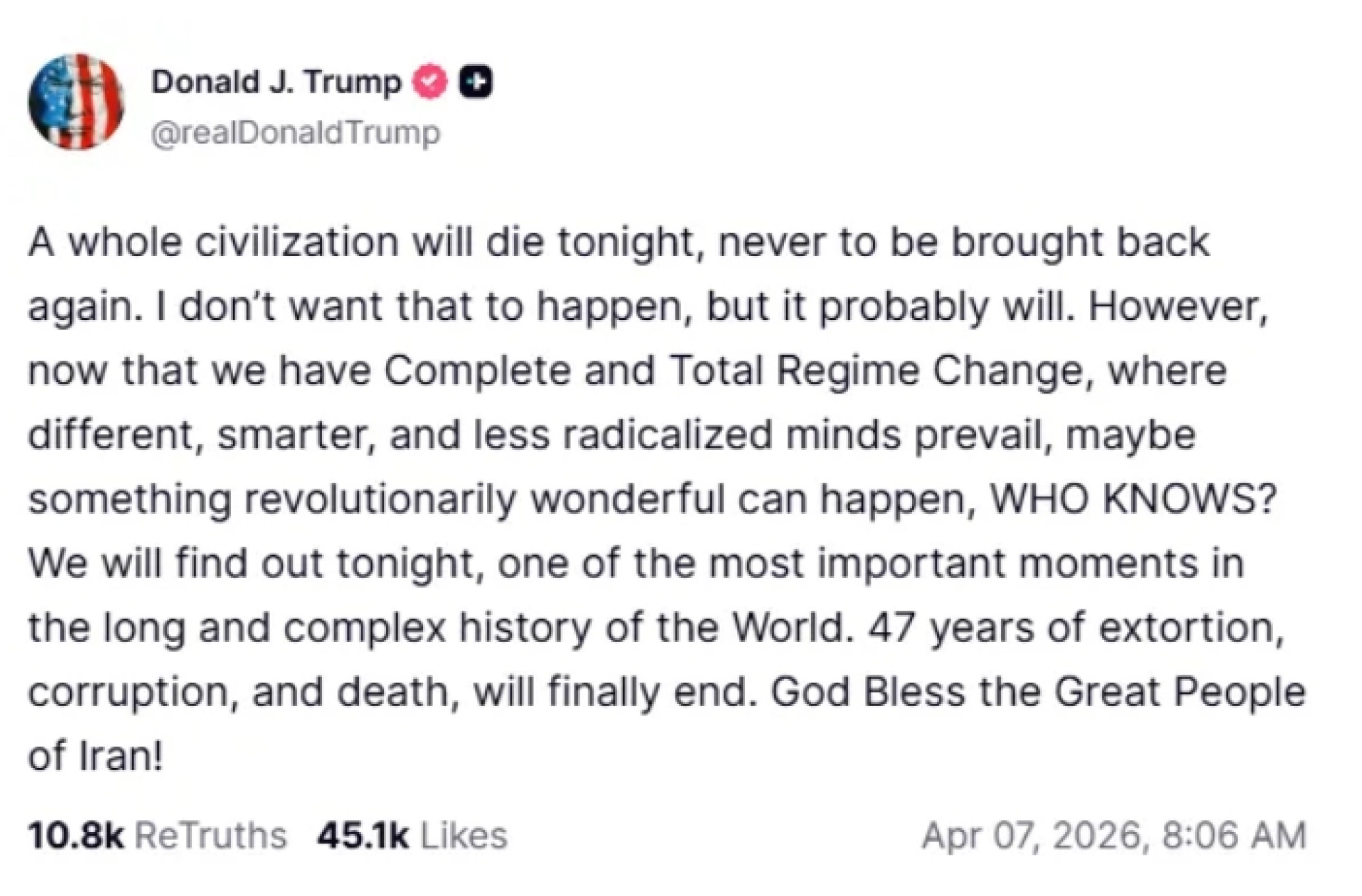 Ovo su bila 24 burna sata u analima rata i mira. U SAD su počela time što je vođa slobodnog sveta zapretio počinjenjem genocida. Evo šta je predsednik Donald Trump objavio na mreži Truth Social rano u utorak: