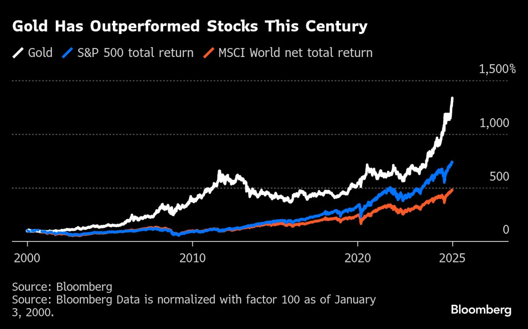 Ovo je prekretnica za zlatne poluge, koji su pre samo dve godine bile ispod 2.000 dolara po unci, a sada donose prinos koji nadmašuju one na akcijama u ovom veku. Zlato je poraslo više od 50 odsto ove godine, suočeno sa nesigurnostima u vezi sa globalnom trgovinom, nezavisnošću Federalnih rezervi i fiskalnom stabilnošću SAD.